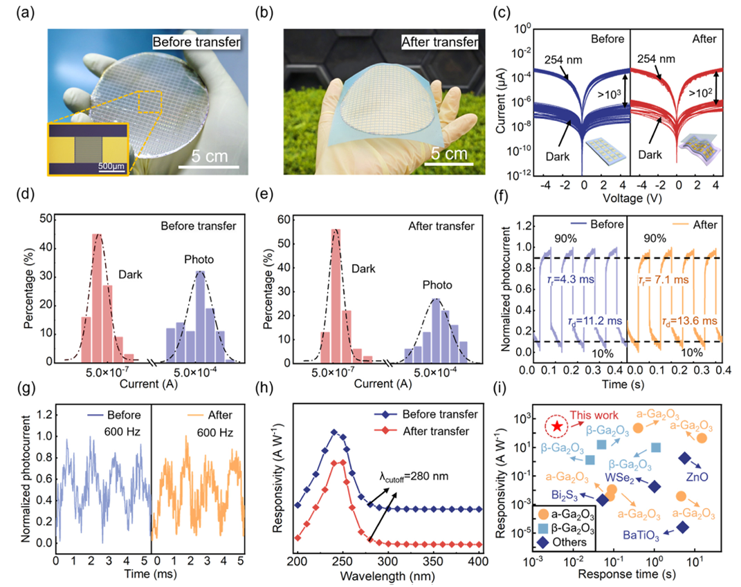 图 4. (a 和 b) 4 英寸柔性器件转移前后照片;(c) 100 个随机选取 UVPD 的 I–V 曲线;(d 和 e) 转移前后 100 个随机选取 UVPD 的暗电流和光电流分布;(f) 10 Hz 调制频率下的瞬态响应时间;(g) 600 Hz 调制频率下的瞬态响应特性;(h) 200–400 nm 波长范围内的响应光谱;(i) UVPD 的响应度和响应时间与已报道结果的对比。