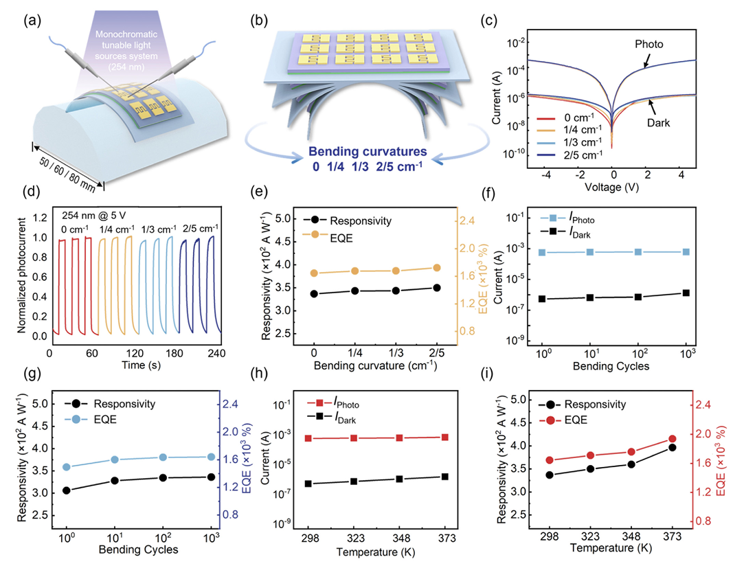 图 5. (a) D 形柱弯曲测试方法示意图;(b) 不同弯曲曲率下的柔性器件示意图;(c) 不同弯曲曲率下柔性器件的 I–V 曲线;(d) 多循环瞬态光响应;(e) 不同弯曲曲率下柔性器件的响应度 (R) 和外量子效率 (EQE);(f) 弯曲循环次数与暗电流 (Id) 及光电流 (Ip) 演变关系图;(g) 响应度 (R) 和 EQE 随弯曲循环次数变化图;(h) 不同工作温度下 Id 和 Ip 的演变图;(i) 不同工作温度下的响应度 (R) 和 EQE。