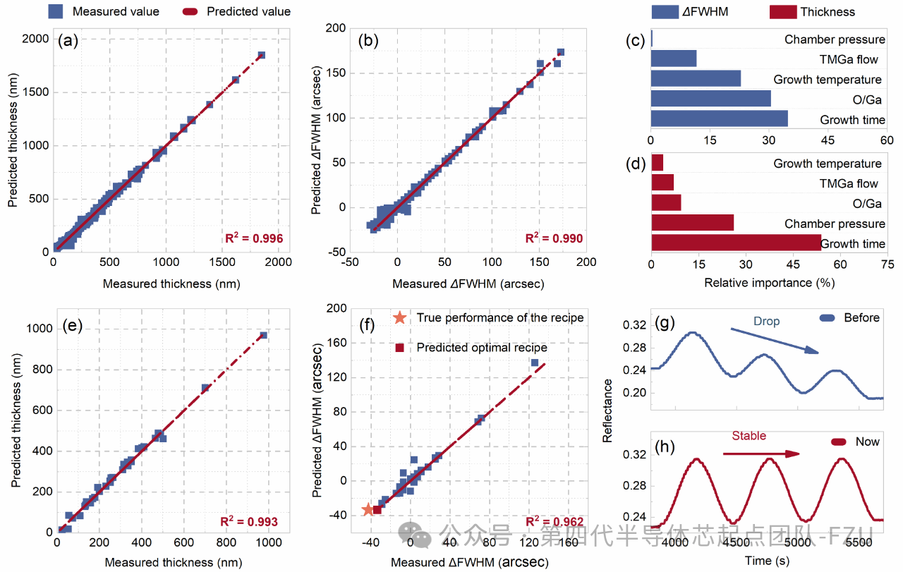 图2(a) 训练数据集的薄膜厚度拟合结果,拟合优度(R²)为 0.996。(b) 训练数据集的半高宽(FWHM)拟合结果,R²为 0.990。蓝色圆点代表实际测量数据,红色虚线代表模型预测数据。其中,R²反映回归模型对数据的拟合程度,两者差异越小,模型预测值与实际结果越接近;R²值越高、越接近 1.000,表明模型拟合效果越好、解释力越强。(c) 外延参数对 ΔFWHM(半高宽变化量)的影响;(d) 外延参数对薄膜厚度的影响。在多项式回归模型中,x 代表解释向量,即反应室压力、三甲基镓(TMGa)流量、生长温度、氧镓比(O/Ga 比)及生长时间。基于拟合模型,可揭示不同解释向量对外延层厚度及晶体质量的影响规律。(e) 测试数据集的薄膜厚度拟合结果,R²为 0.993;(f) 测试数据集的半高宽FWHM拟合结果,R²为 0.962。同理,蓝色圆点代表实际测量值,红色虚线代表模型预测值。模型的最优预测工艺配方用红色方块标注,采用该配方生长的样品其测量值用橙色五角星标注。模型在测试数据集上仍表现出优异的拟合性能,表明其对外延生长结果的预测具有较高准确性和可靠性,也证明该模型对外延过程具备可靠的解释能力。(g) 无机器学习指导工艺优化的原位实时干涉曲线;(h) 经机器学习指导工艺优化的原位实时干涉曲线。激光束经外延层表面反射形成干涉图案,记录为实时曲线。该曲线可反映生长速率与表面粗糙度,其中反射率的显著下降表明表面发生严重粗糙化。在相同生长速率下,反射率未出现下降趋势,说明外延层生长条件得到显著优化。