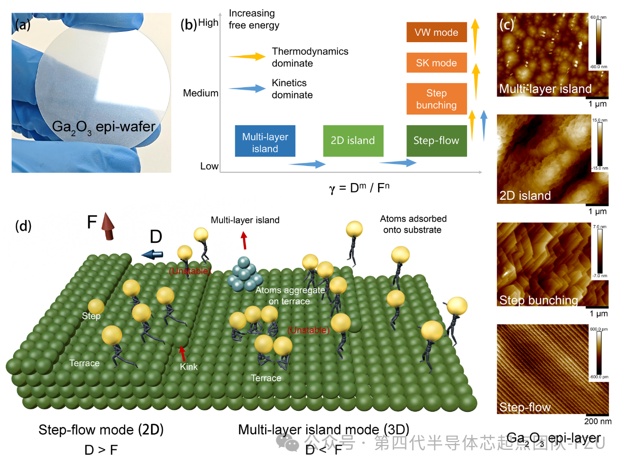 图1 (a) 2 英寸高质量β-Ga2O3同质外延片的实物照片。(b) 从热力学与动力学角度构建的外延相图。y轴代表体系自由能,x轴代表主要生长因子 γ,该因子由热扩散系数 D 与外延总沉积速率 F 共同构成。(c) β-Ga2O3同质外延层的多层岛状、二维岛状、台阶聚束及台阶流四种生长模式的原子力显微镜(AFM)图像。本实验观测了不同生长模式下外延层的表面形貌特征:多层岛状、二维岛状及台阶聚束模式均见于历史数据,而台阶流模式在机器学习(ML)指导下得以实现。(d) 用于描述台阶流与多层岛状生长模式动力学过程的 TSK 模型示意图。现代外延理论指出,台阶流生长模式的实现需满足质量输运控制区间的条件。