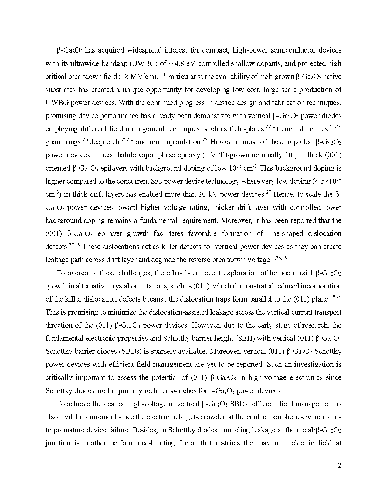 β-Ga2O3 因其约 4.8 eV 的超宽带隙、可控浅掺杂以及高临界击穿场强(约8 MV/cm),在紧凑型高功率半导体器件中引起广泛关注。尤其是熔体生长的 β-Ga2O3 本征衬底的可获得性,为超宽带隙功率器件的大规模低成本制备提供了独特机会。尽管已有多种场管理技术(如场板、沟槽结构、保护环、深刻蚀和离子注入)在垂直 β-Ga2O3 功率二极管中展示出优异性能,但多数器件仍采用 HVPE 生长的厚度约 10 μm、(001) 取向的 β-Ga2O3 外延层,其背景掺杂较高,且易形成线状位错,这些“致命缺陷”会导致漏电和击穿电压下降,限制器件高压扩展。为克服这一问题,(011) 取向的 β-Ga2O3 同质外延生长被提出,可减少位错对垂直电流方向漏电的影响。然而,目前 (011) β-Ga2O3 肖特基二极管的基本电子特性及高压性能尚缺系统研究。为实现千伏级高压器件,边缘场管理和肖特基接触工程至关重要,可有效抑制金属/β-Ga2O3 结的隧穿漏电并提升击穿电压。本研究通过在(011) β-Ga2O3 垂直肖特基二极管中集成高介电常数(ZrO2)场板并优化复合 Pt cap/PtOx/Pt (1.5 nm) 阳极接触,成功实现了超低漏电、多千伏击穿电压以及低导通电压,展示了 (011) β-Ga2O3 在高压功率器件中的应用潜力及设计策略。