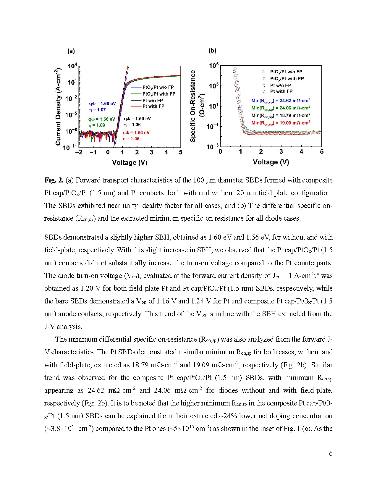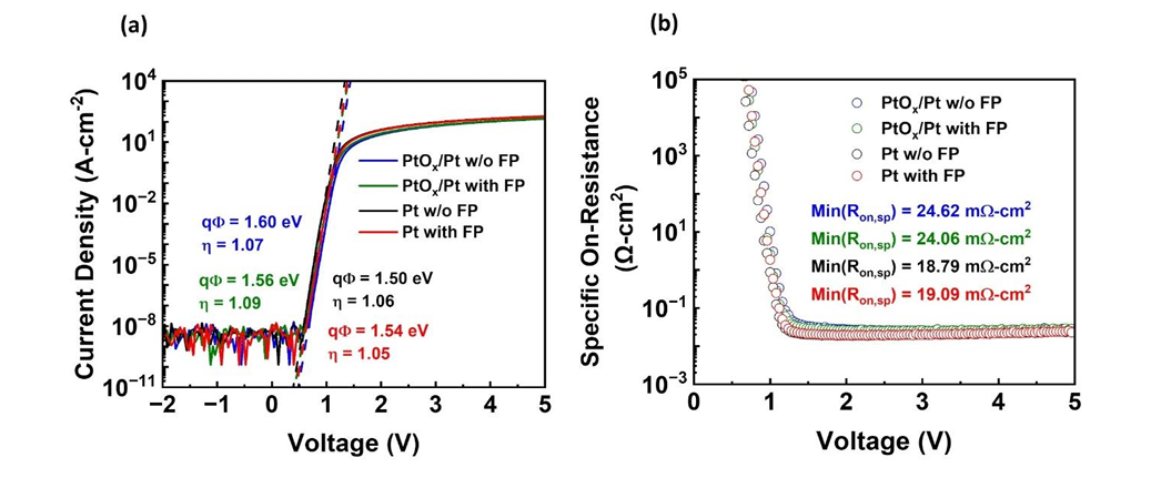 图2:(a) 展示了直径为 100 μm 的肖特基二极管的正向传输特性,器件分别采用复合 Pt cap/PtOx/Pt(1.5 nm)接触和单层 Pt 接触结构,并对比了有无 20 μm 场板结构的情况。所有样品的理想因子均接近 1,表现出优异的整流特性。(b) 展示了各类二极管的微分比导通电阻(Ron,sp)以及提取的最小比导通电阻。