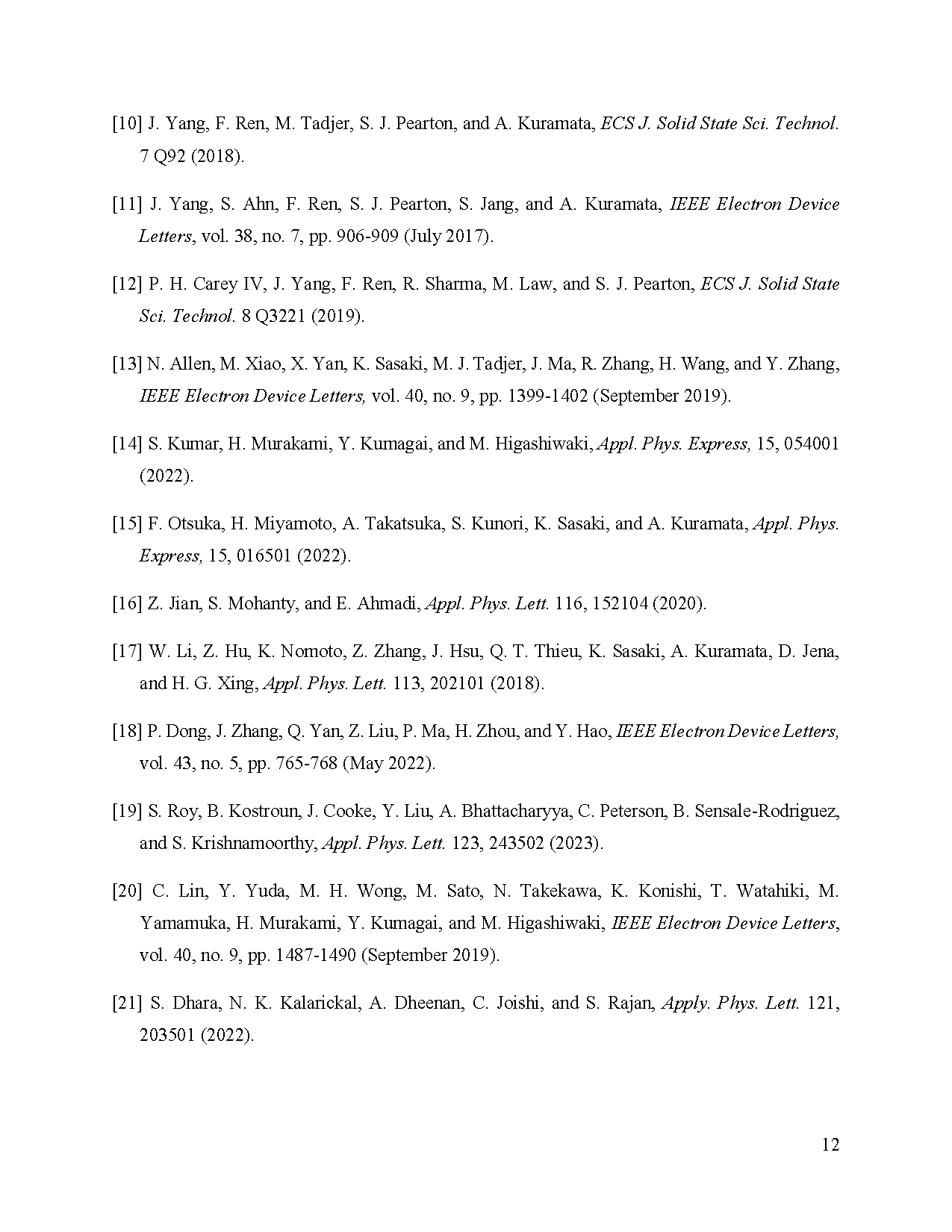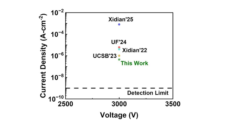 图4:3 kV 条件下反向漏电流密度的基准对比图,展示了制备的垂直 (011) β-Ga2O3 肖特基二极管(SBD)与文献中报道的基于 (001) 外延片的垂直 β-Ga2O3 SBD 的性能对比。