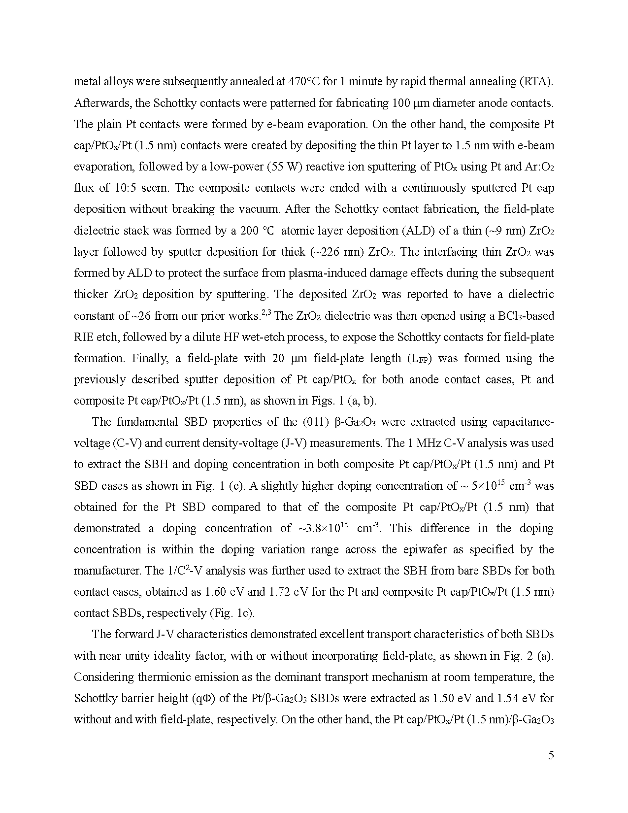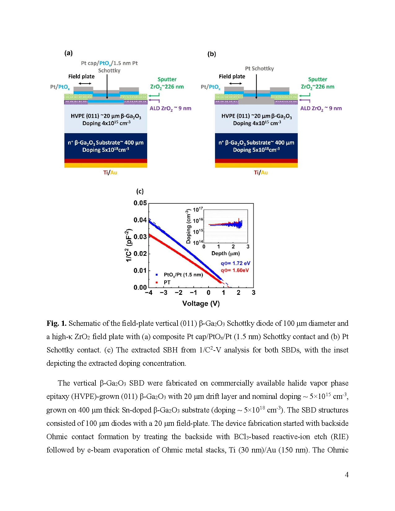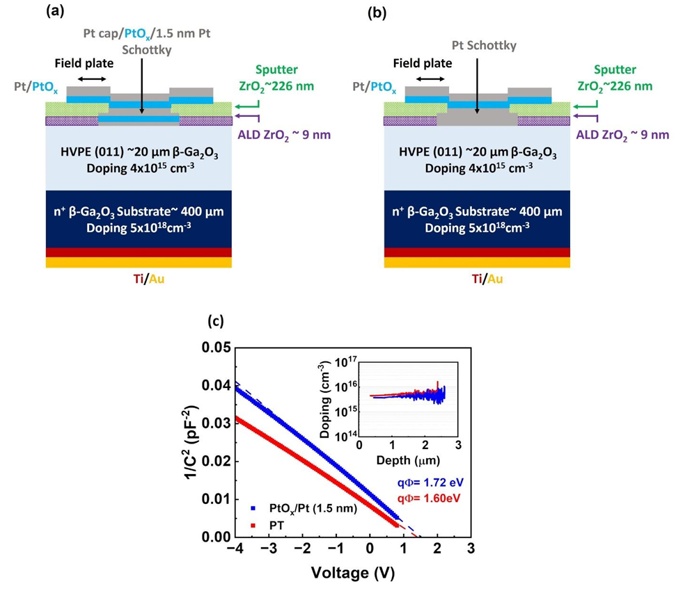 图1:(a) 和 (b) 分别为带高介电常数 ZrO2 场板的垂直型 (011) β-Ga2O3 肖特基二极管的结构示意图,器件直径为 100 μm。(a) 为复合 Pt cap/PtOx/Pt(总厚 1.5 nm)肖特基接触结构;(b) 为单层 Pt 肖特基接触结构。(c) 为两种二极管通过 1/C2–V 分析提取的肖特基势垒高度(SBH),插图显示对应的掺杂浓度。