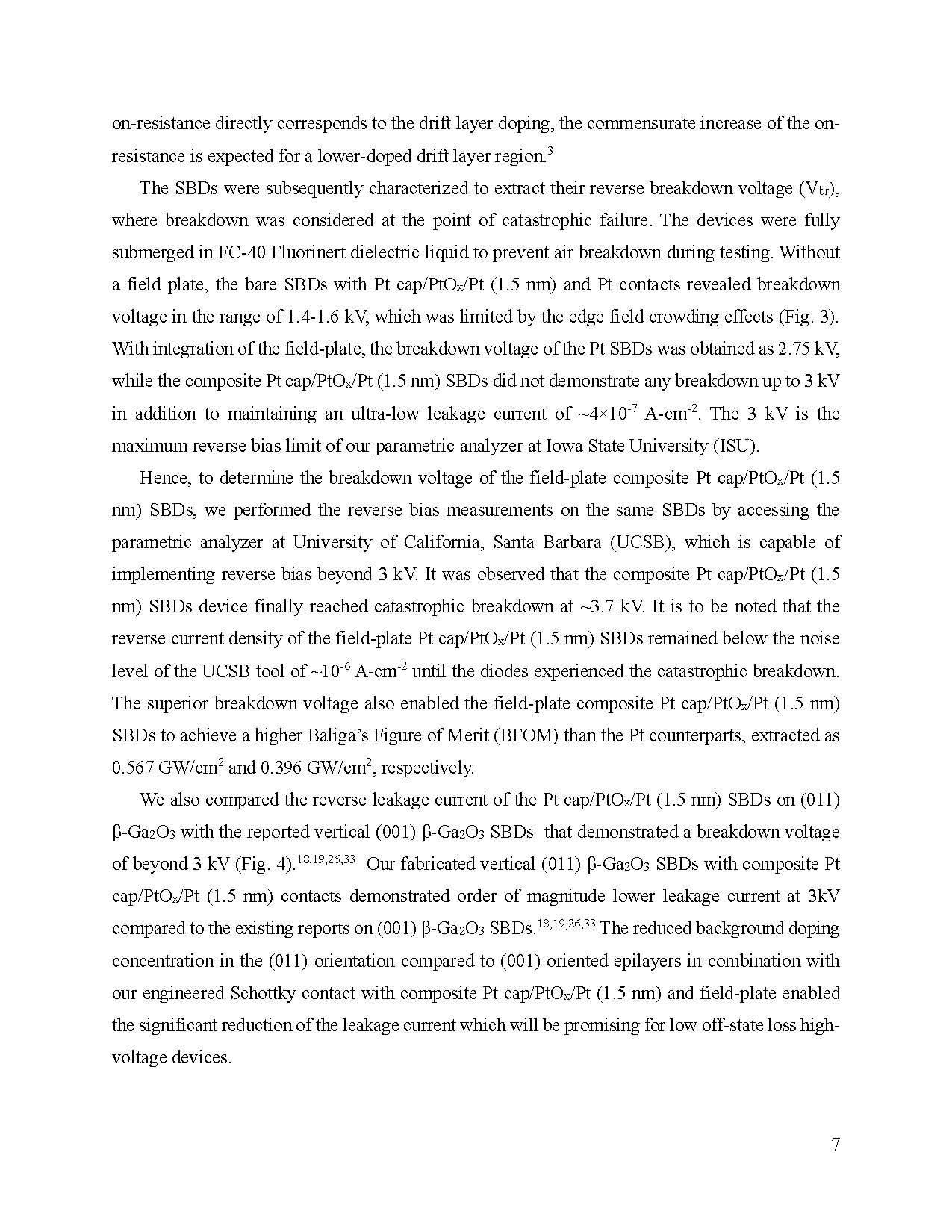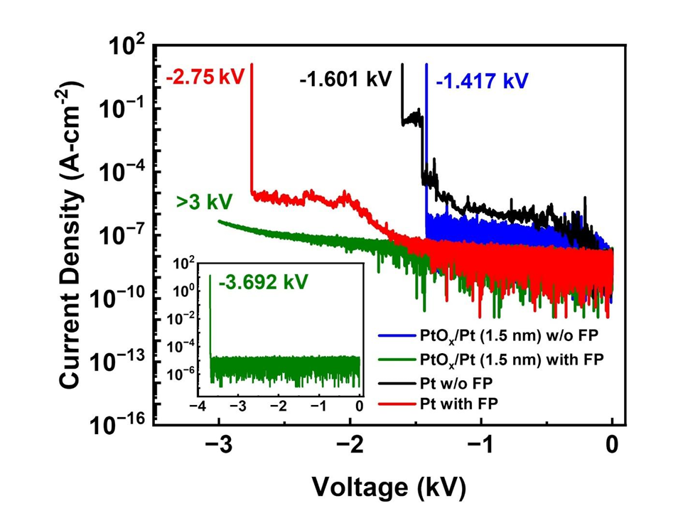 图3:直径为 100 μm 的肖特基二极管(SBD)的反向 J–V 特性,比较了复合 Pt cap/PtOx/Pt(1.5 nm)接触和单层 Pt 接触器件在有无 20 μm 场板的情况下的表现。未加场板时,两类器件的击穿电压相近,约在 1.4–1.6 kV 范围。加上场板后,复合 Pt cap/PtOx/Pt(1.5 nm)器件的反向漏电流显著降低,击穿电压稳定提高至超过 3 kV。插图展示了带场板的复合接触器件的击穿特性,该测试使用 UCSB 的独立参数分析仪完成,可测量超过 3 kV,但噪声底较高。