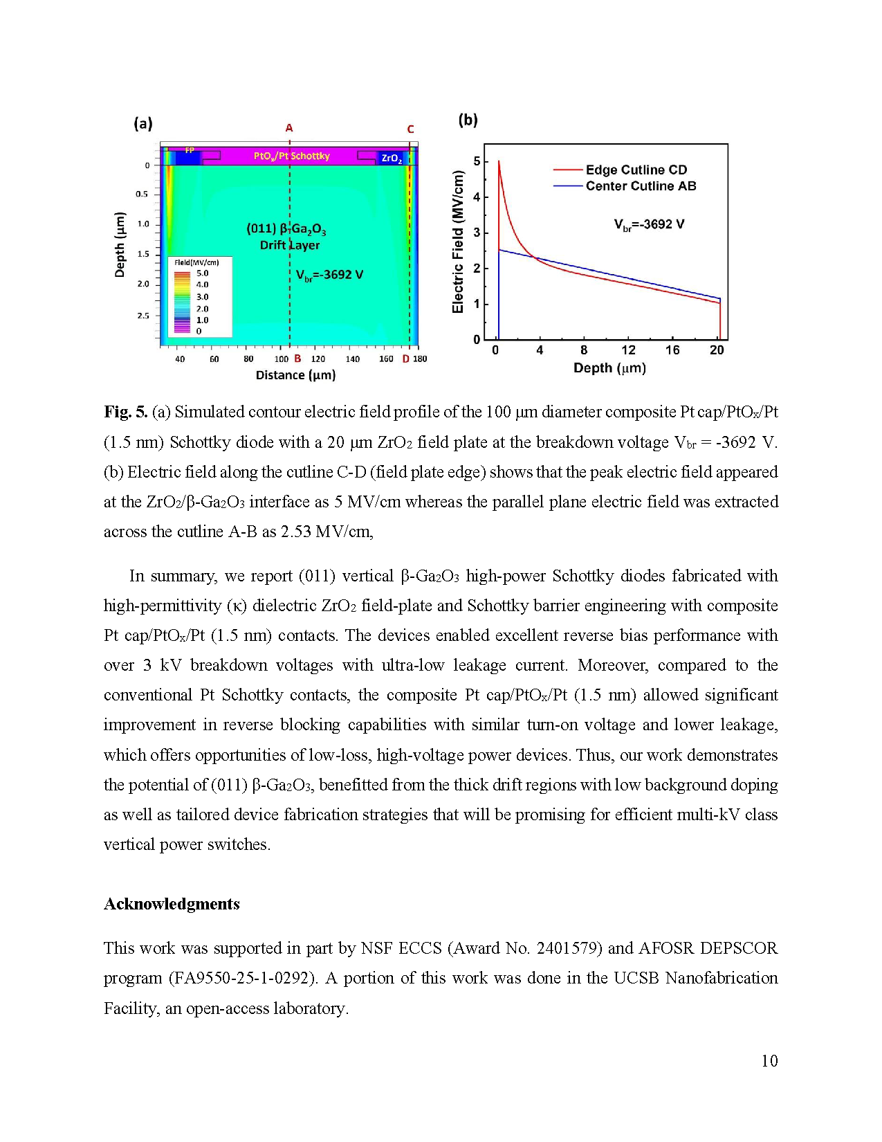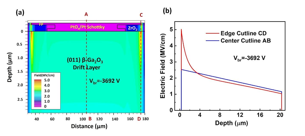 图5:(a) 模拟的电场等高线分布图,显示直径 100 μm 的复合 Pt cap/PtOx/Pt (1.5 nm) 肖特基二极管在 20 μm ZrO2 场板下的电场分布,击穿电压为 Vbr = -3692 V。(b) 沿切线 C-D(场板边缘)的电场显示,峰值电场出现在 ZrO2/β-Ga2O3 界面,为 5 MV/cm;沿平行平面切线 A-B 提取的电场为 2.53 MV/cm。