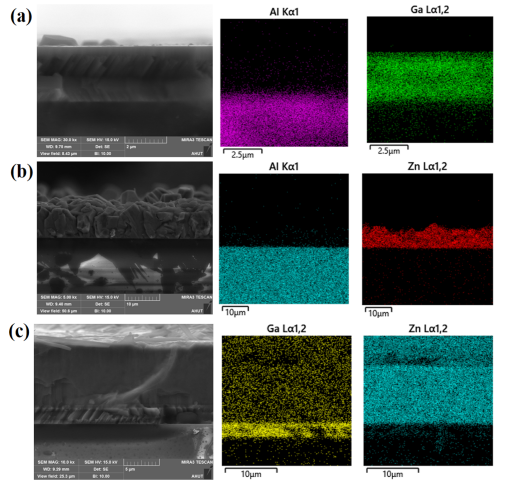 图6. 薄膜横截面及其对应的能谱分析(EDS)能量谱:(a)ε-Ga2O3,(b)ZnO(直接生长),(c)ZnO(感应层)。