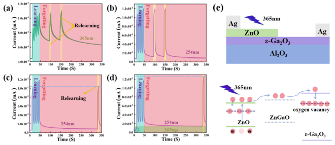 图9. (a) 365 nm 光照下“遗忘(50 S)与再学习”的行为模拟。 (b) 254 nm 光照下“遗忘 (50 S) 与再学习”的行为模拟。 (c) 254 nm 光照下“遗忘 (280 S) 与再学习”的行为模拟。(d) 在 365 nm 光持续存在下,使用代表高强度刺激的 254 nm 脉冲光进行的“遗忘 (280 S) 与再学习”行为模拟。 (e) 365 nm 光对抵抗力持续影响的作用原理。