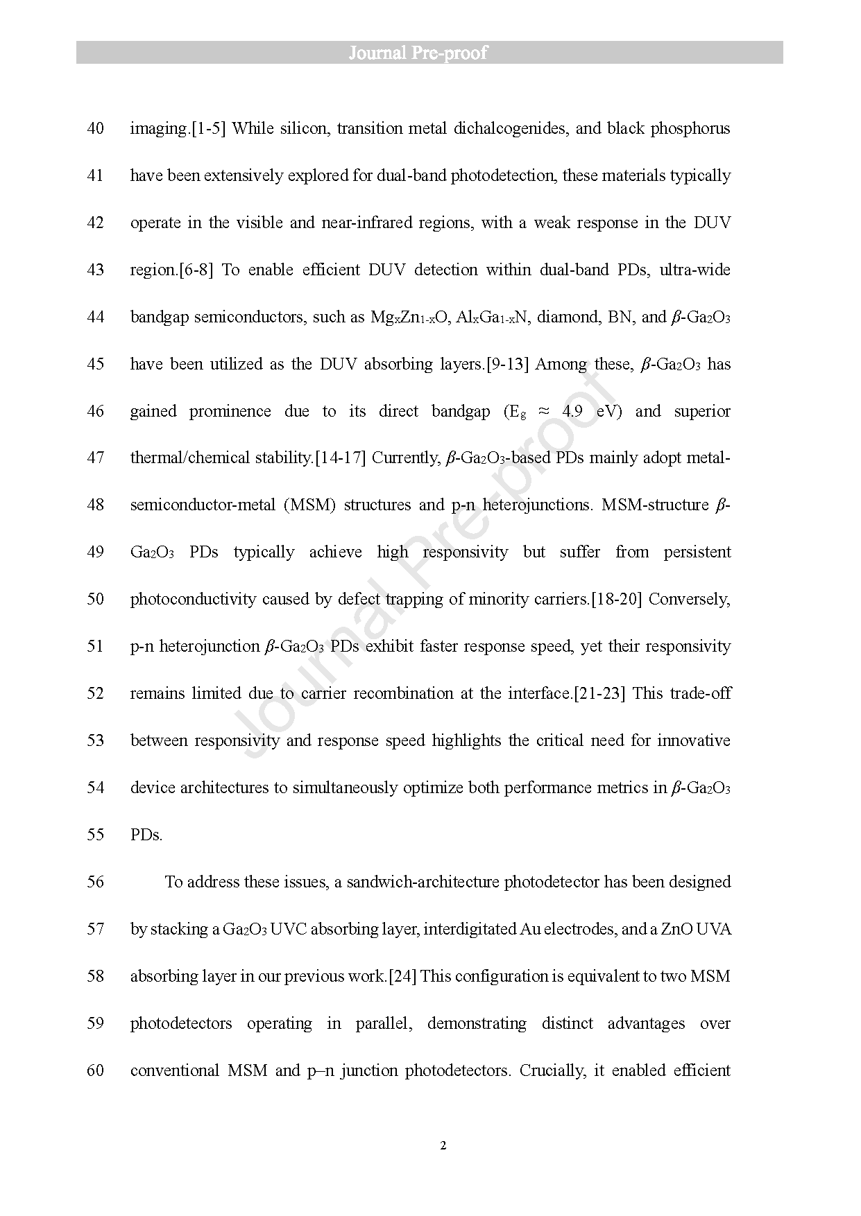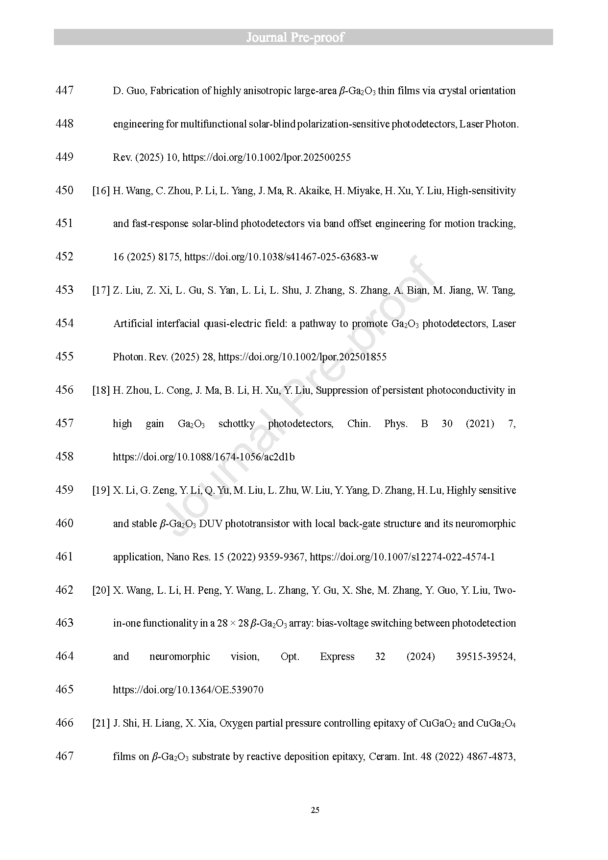 受人脑启发的神经形态计算是下一代人工智能的有效途径,具有高效率和低功耗的优势。 光电突触是构建神经形态视觉系统(NVS)的核心硬件。日盲深紫外(DUV)波段(200-280 nm)的NVS在火焰探测、安全通信等领域具有重要应用,因为其在地球表面几乎没有背景噪声干扰。 氧化镓(Ga2O3)是制造 DUV 器件的理想材料,但现有的 Ga2O3 基光电突触普遍存在权重更新线性度差和可区分电导态数量少的瓶颈,这严重限制了神经形态系统的识别精度。