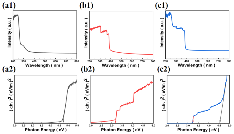 图2. (a1−c1) ε-Ga2O3、ZnO(直接生长)和 ZnO(诱导层)的紫外-可见吸收光谱;(a2−c2) ε-Ga2O3、ZnO(直接生长)和 ZnO(诱导层)的禁带宽度。