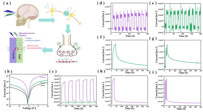 图7. (a) ε-Ga2O3/ZnO 异质结人工突触示意图。(b) 暗光、254 nm 及 365 nm 光照条件下异质结的输出曲线。(c) 异质结在 254 和 365 nm 光照下的光响应曲线(10 V 正向偏压)。(d) 254 nm 脉冲光信号下的自供电曲线。(e) 365 nm 脉冲光信号下的自供电曲线。(f) 365 nm 单脉冲(30 S)光信号。(g) 365 nm 双脉冲光信号的成对脉冲促进效应(10 S)。(h) 254 nm 单脉冲(30 S)光信号。(i) 254 nm 双脉冲光信号的成对脉冲促进效应(10 S)。