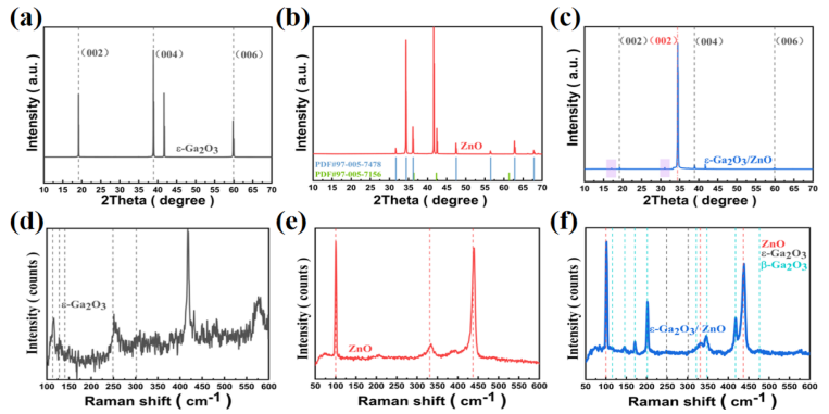 图1. (a−c) ε-Ga2O3、ZnO(直接生长)和 ZnO(诱导层)的 XRD 衍射图谱;(d−f) ε-Ga2O3、ZnO(直接生长)和 ZnO(诱导层)的拉曼光谱图谱。