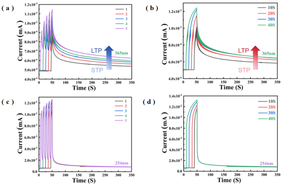 图8. 365 nm 光照后的忆阻特性:(a) 不同脉冲数;(b) 不同光照时间。254 nm 光照:(c) 不同脉冲数;(d) 不同光照时间。