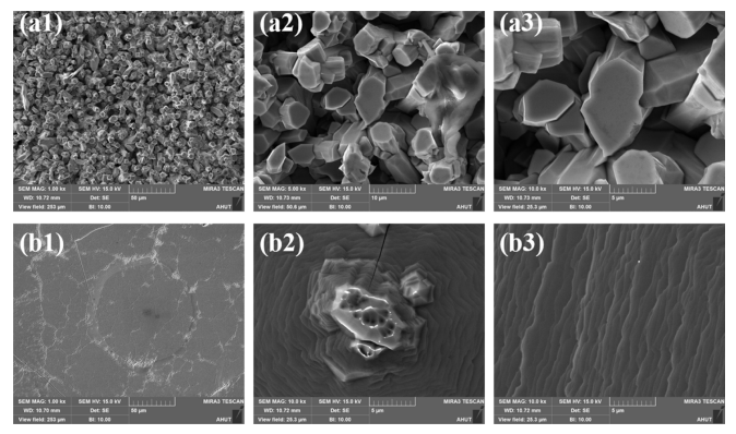 图4. (a1−a3) ZnO(直接生长)与 (b1−b3) ZnO(感应层)的表面形貌(1000×、5000×及10000×放大)。