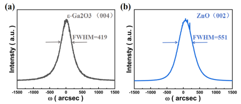 图3. (a) ε-Ga2O3 薄膜的 (004) 表面摇摆谱,(b) ZnO(感应层)的 (002) 表面摇摆谱。