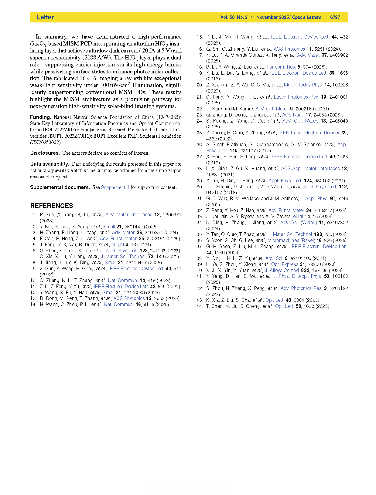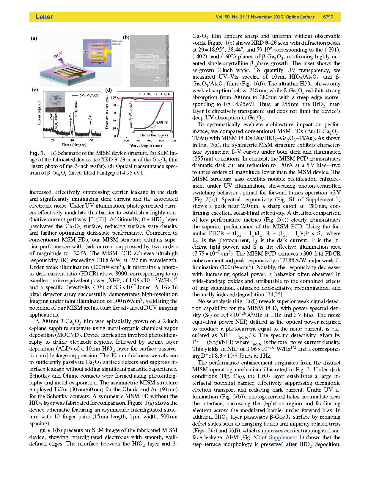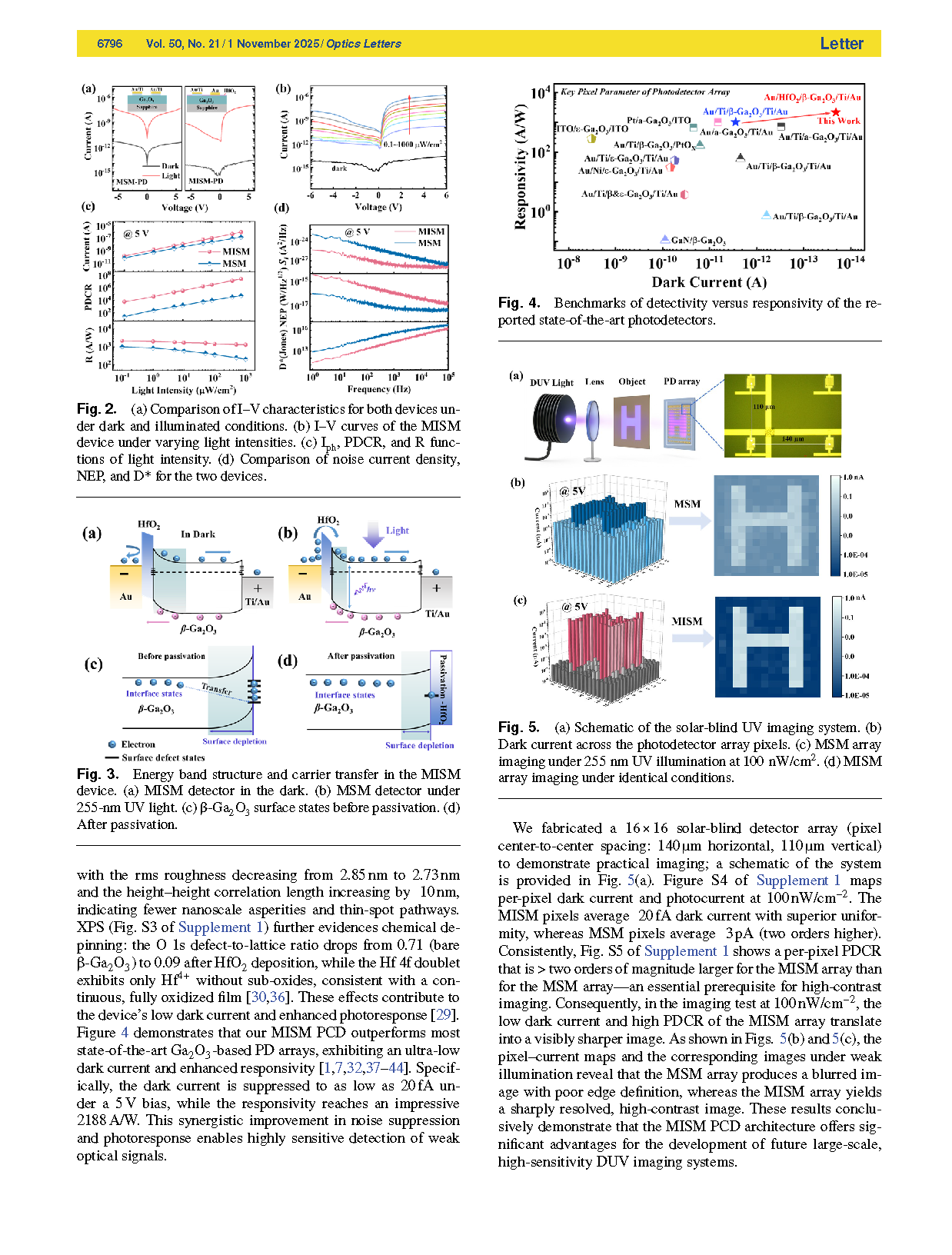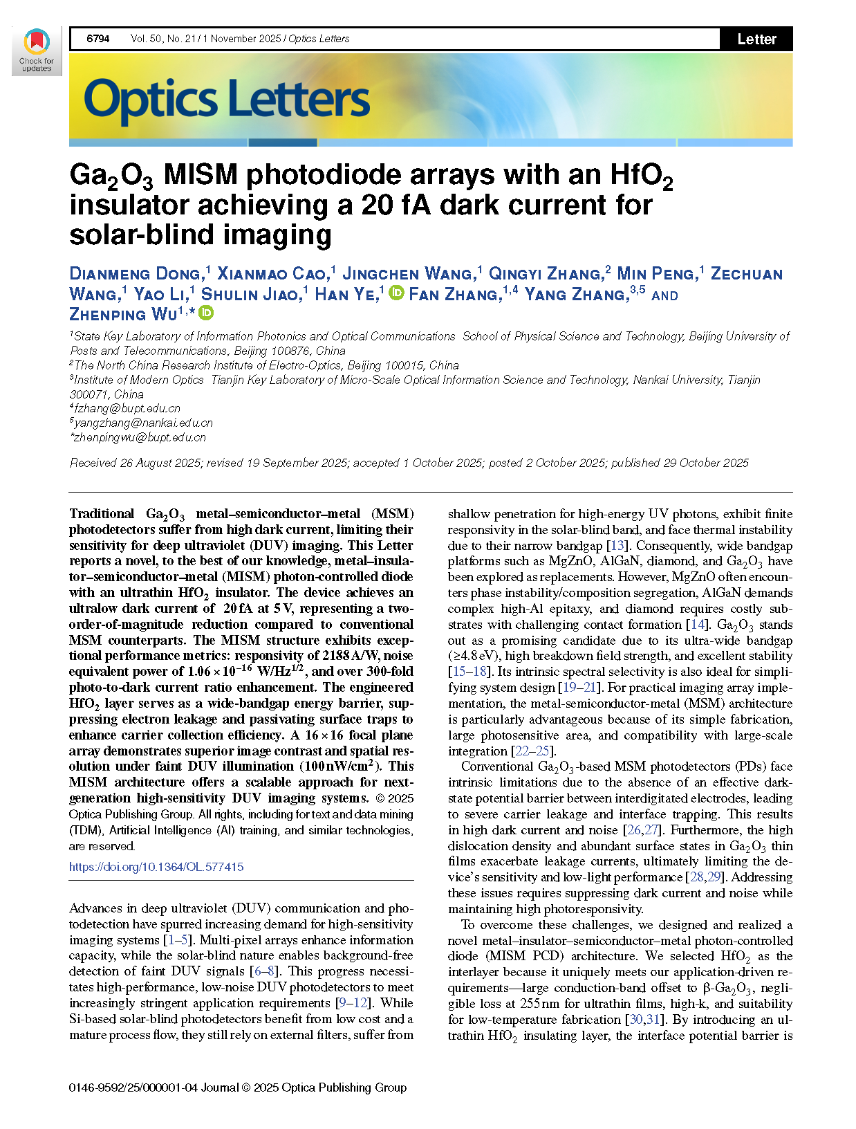 由北京邮电大学吴真平教授领导的研究团队在学术期刊 Optics Letters 发布了一篇名为 Ga2O3 MISM photodiode arrays with an HfO2 insulator achieving a 20 fA dark current for solar-blind imaging(采用HfO2 绝缘层的 Ga2O3 MISM 光电二极管阵列实现 20 fA 超低暗电流日盲成像)的文章。