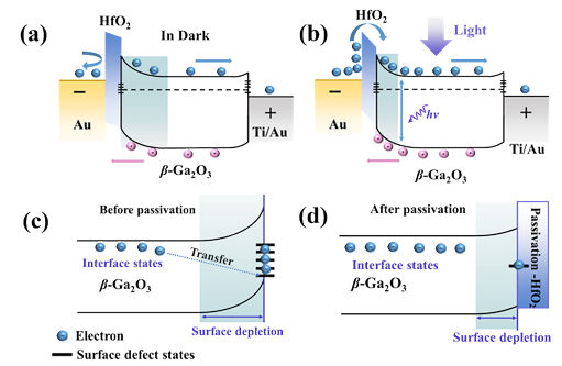 图 3. MISM 器件的能带结构及载流子传输。(a) 暗态下的 MISM 探测器。(b) 255 nm 紫外光照射下的 MSM 探测器。(c) 钝化前的 β-Ga2O3 表面态。(d) 钝化后的 β-Ga2O3 表面态。