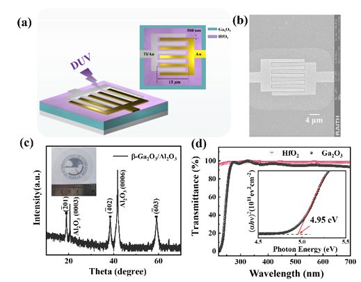 图 1.(a) MISM 器件结构示意图。(b) 制备器件的 SEM 图像。(c) Ga2O3 薄膜的 XRD θ–2θ 扫描(插图:2 英寸晶圆照片)。(d) β-Ga2O3 光学透射率谱(插图:拟合带隙为 4.95 eV)。