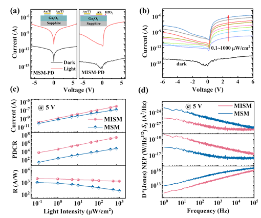 近年来,随着深紫外(DUV)通信与光探测技术的发展,对高灵敏度成像系统的需求不断增长。多像素阵列能够提升信息容量,而其日盲特性则可实现微弱信号的无背景检测。硅基日盲光电探测器虽然成本低、工艺成熟,但仍需外部滤光器、高能紫外光穿透浅、响应度有限且热稳定性差,因此宽禁带半导体如 MgZnO、AlGaN、金刚石和 Ga2O3 成为替代选择。其中,Ga2O3 以其超宽禁带(≥4.8 eV)、高击穿场强和优异稳定性表现突出,非常适合 DUV 探测。传统 Ga2O3 MSM 光电探测器因电极间缺乏有效势垒而存在暗电流和噪声过高的问题,表面态和位错密度又加剧了泄漏电流,限制了器件的低光性能。为解决这些问题,本研究提出并实现了一种基于 HfO2 绝缘层的 MISM 光控二极管结构,通过增加界面势垒抑制暗电流、降低噪声,同时在紫外照射下实现高光响应,为高性能 DUV 成像提供了新的解决方案。