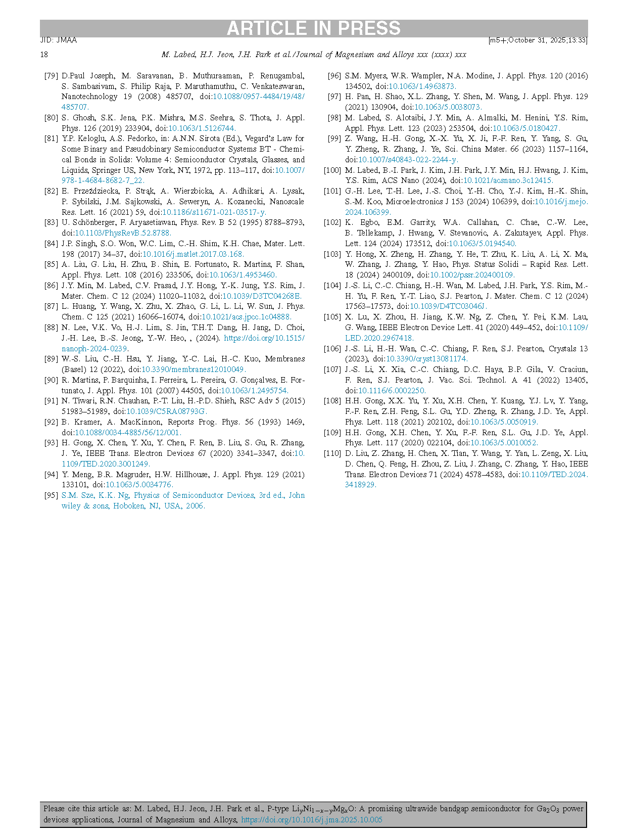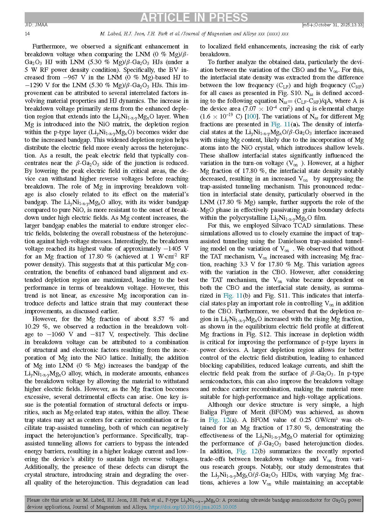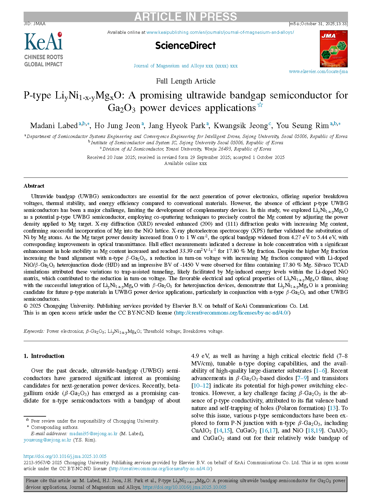 由韩国世宗大学的研究团队在学术期刊 Journal of Magnesium and Alloys 发布了一篇名为 P-type LiyNi1-x-yMgxO: A promising ultrawide bandgap semiconductor for Ga2O3 power devices applications(P型 LiyNi1-x-yMgxO:一种在氧化镓功率器件应用中具有潜力的超宽禁带半导体)的文章。