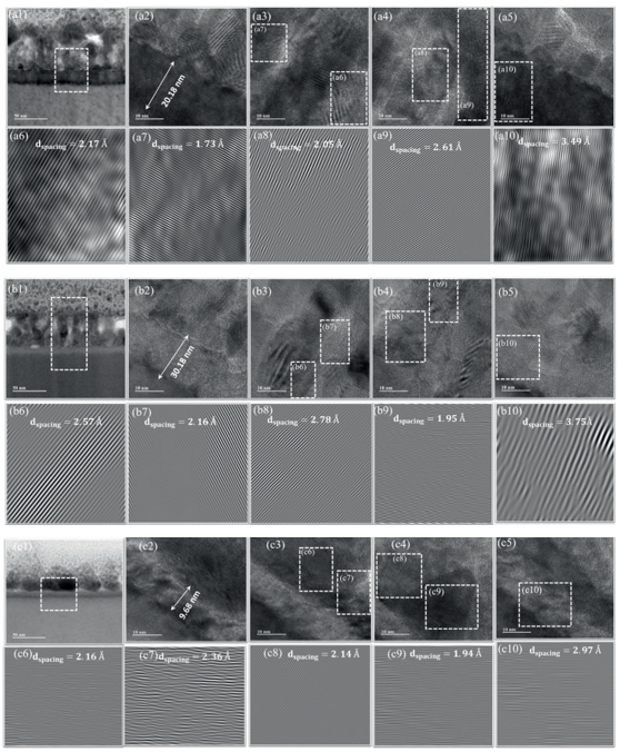 图 5. TEM 图像展示了不同 Mg 含量下 LiyNi1-x-yMgxO/ β-Ga2O3 异质结界面:(a) LNM(0% Mg):(a1) 和 (a2) 显示界面层形成;(a3)–(a9) 为逆快速傅里叶变换(IFFT)图像,突出不同晶向;(a10) 显示对应的界面层。(b) LNM(8.57% Mg):(b1) 和 (b2) 展示界面区域;(b3)–(b9) 为不同晶向的 IFFT 图像;(b10) 显示对应的界面层。(c) LNM(17.80% Mg):(c1) 和 (c2) 显示界面区域;(c3)–(c9) 为不同晶向的 IFFT 图像;(c10) 突出界面层结构。