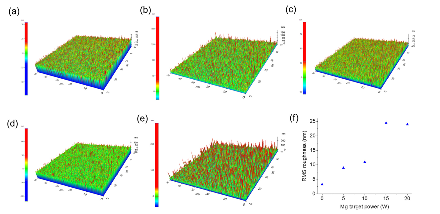 图 3. (a) LNM(0% Mg)、(b) LNM(5.30% Mg)、(c) LNM(8.57% Mg)、(d) LNM(10.29% Mg)、(e) LNM(17.80% Mg)的 AFM 图像,以及 (f) 提取的 RMS 表面粗糙度。