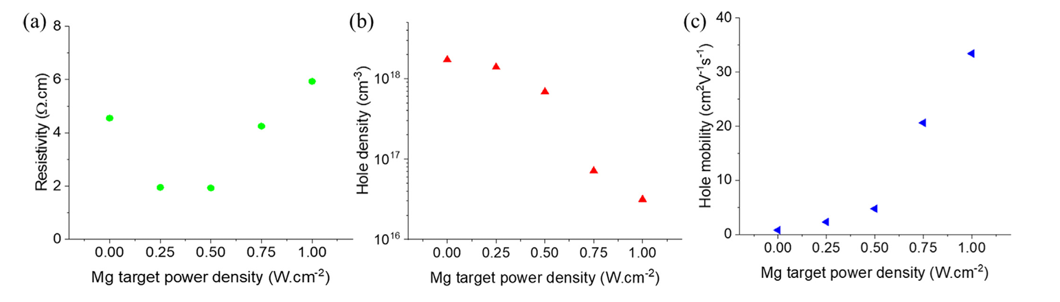 图 7. 室温下不同 Mg 靶射 RF 功率密度下 LiyNi1-x-yMgxO 的 (a) 电阻率,(b) 空穴浓度,(c) 空穴迁移率测量结果。