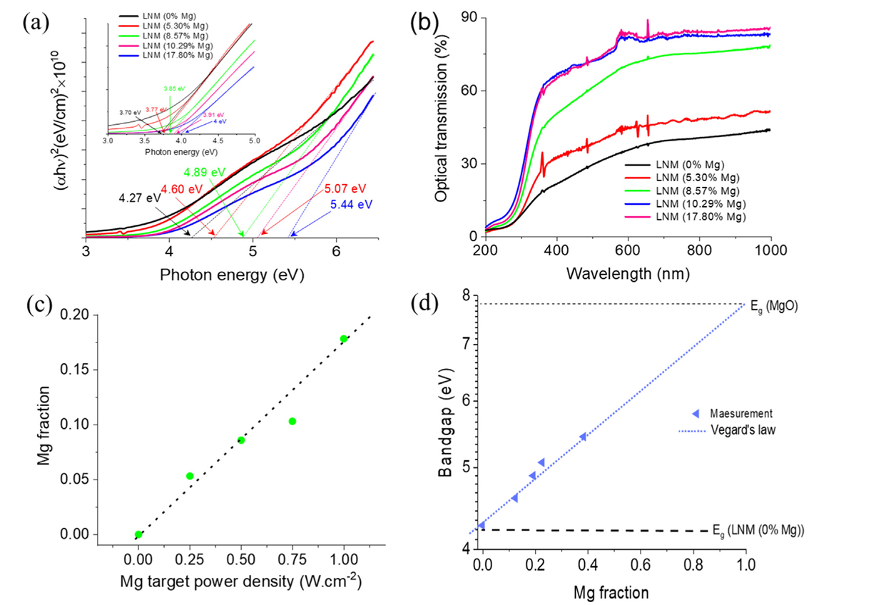 图 6. (a) LiyNi1-x-yMgxO 的光学吸收,显示直接带隙,插图显示间接带隙;(b) 光学透过率;(c) 提取的 Mg 含量随 Mg 靶射 RF 功率密度的变化;(d) LiyNi1-x-yMgxO 直接带隙随 Mg 含量的变化。