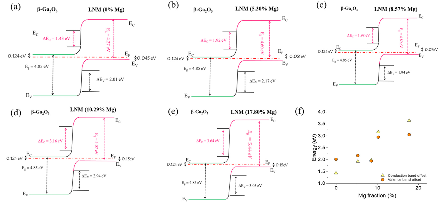 图 9. 不同 Mg 含量下 LiyNi1-x-yMgxO/ β-Ga2O3 异质结的能带对齐:(a) LNM(0% Mg),(b) LNM(5.30% Mg),(c) LNM(8.57% Mg),(d) LNM(10.29% Mg),(e) LNM(17.80% Mg),以及 (f) 导带偏移(CBO)和价带偏移(VBO)随 Mg 含量变化的对应关系。