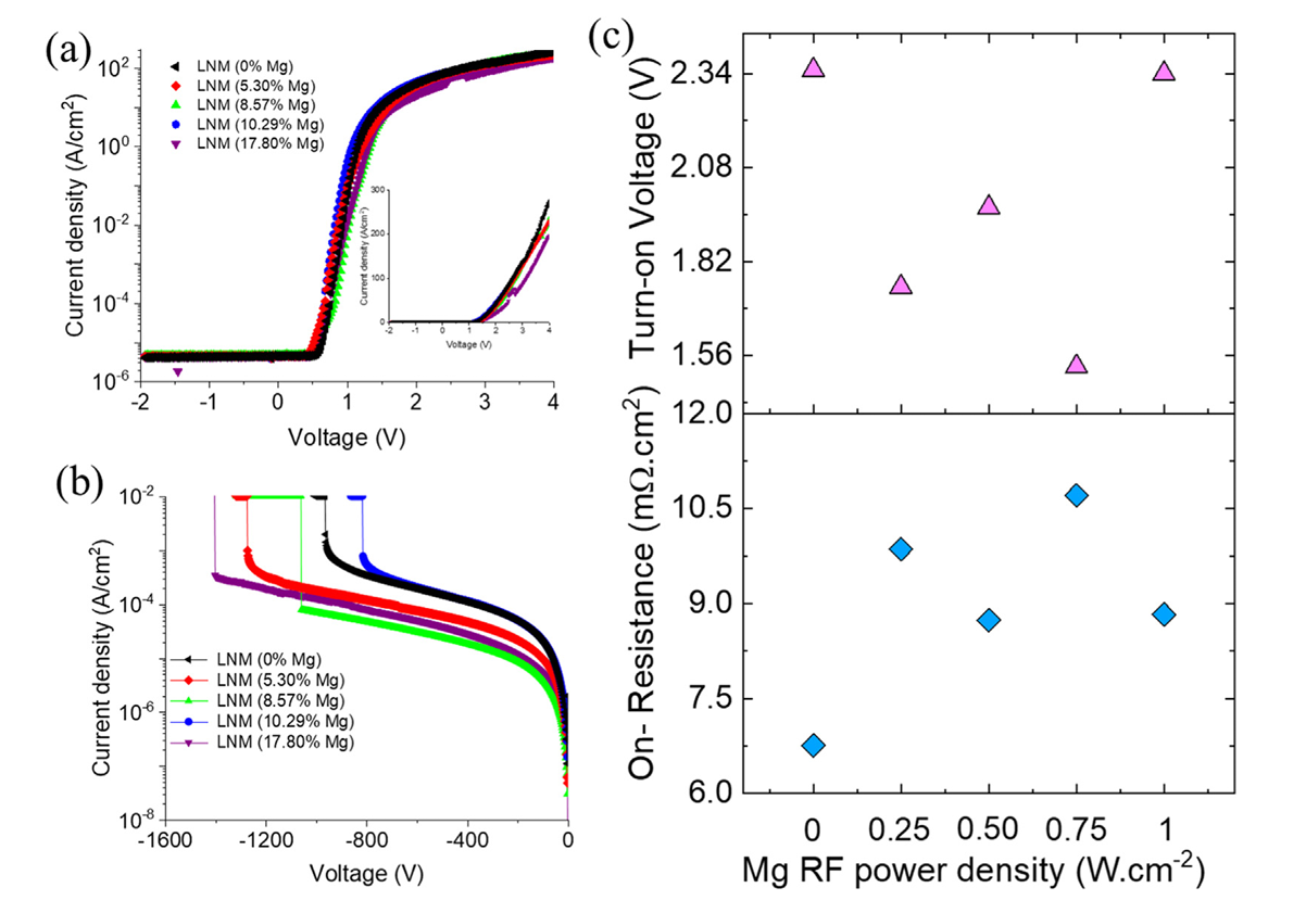 图 10. Mg 含量对 Li 掺杂 Ni1-xMgxO 的影响:(a) 正向电流的对数坐标曲线(插图为线性坐标),(b) 击穿电压,以及 (c)LiyNi1-x-yMgxO/ β-Ga2O3 异质结二极管(HJD)的提取开启电压 (Von) 和导通电阻 (Ron)。