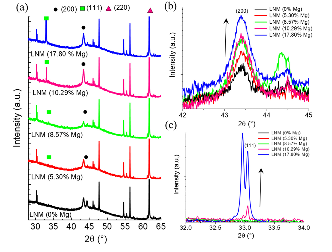 图 2. (a) p 型 LiyNi1-x-yMgxO 薄膜的 XRD 图谱,(b) 不同 Mg 靶射 RF 功率下的 (200) 晶向,(c) 不同 Mg 靶射 RF 功率下的 (111) 晶向。