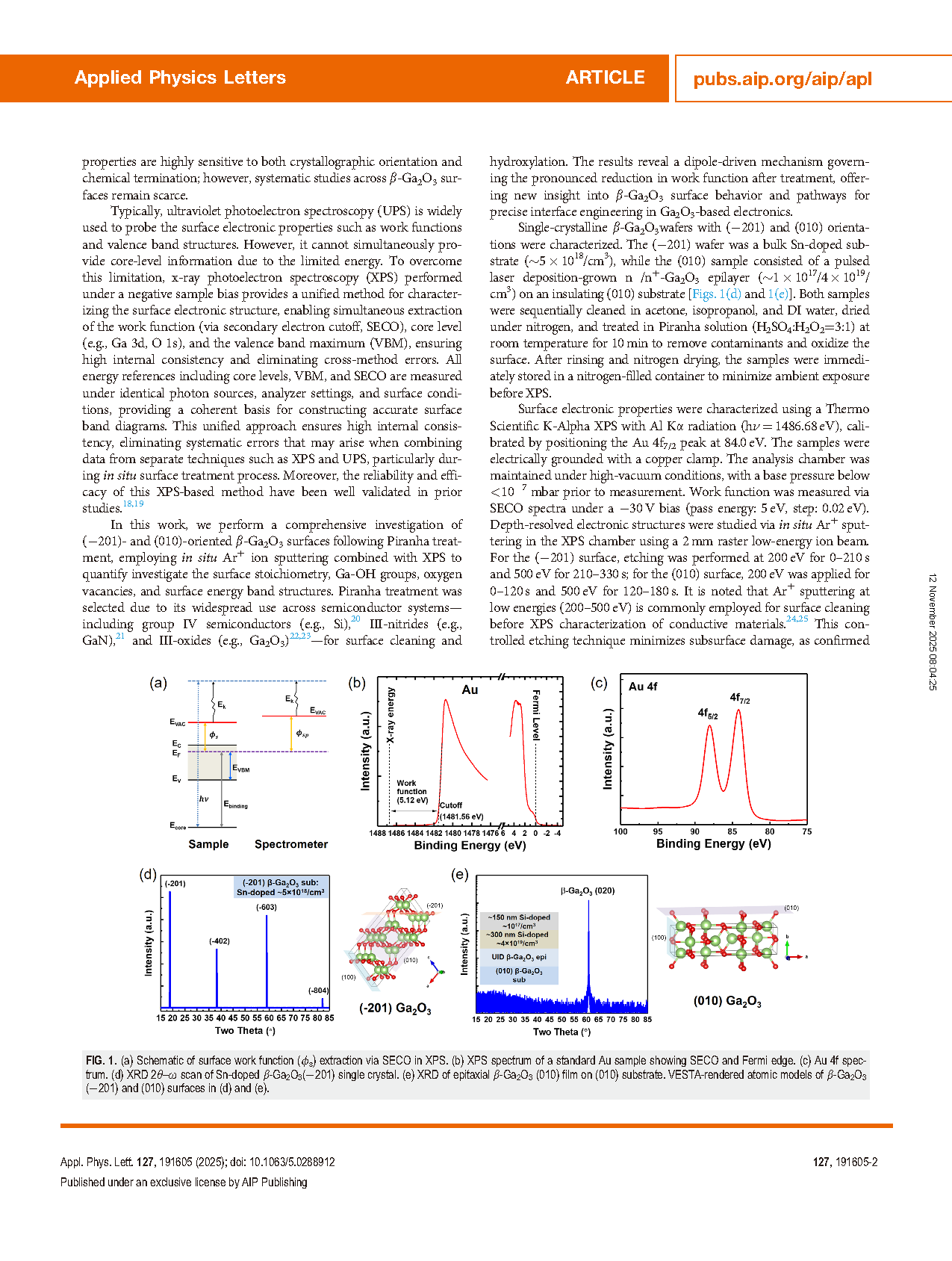 超宽禁带半导体在下一代功率电子器件、深紫外光电子器件及极端环境传感中展现出重要应用前景,其中 β-Ga2O3 因其宽禁带(4.6–5 eV)、高击穿电场(8 MV/cm)以及大尺寸单晶衬底的可获得性而备受关注。不同晶向中,(010) 晶面电子迁移率较高,适合高功率高频应用;(-201) 晶面热力学稳定性最高,利于异质外延生长,两者均是高性能器件制备的可靠平台。为了提升表面洁净度、化学计量比及界面质量,研究者采用 HF、HCl、H2O2、紫外/臭氧气体处理、CF4/O2 等表面处理技术,其中 Piranha 溶液(H2SO4:H2O2)被广泛用于去除有机残留并促进富氧终端形成,显著改善 ALD-Al2O3/β-Ga2O3 界面质量并降低界面陷阱密度。然而,表面处理前后 β-Ga2O3 的电子结构演变及功函数、表面能带弯曲和真空能级对齐对界面行为的影响仍缺乏系统研究。紫外光电子能谱(UPS)可用于探测功函数和价带结构,但无法提供核心能级信息;在负偏压下进行的 X 射线光电子能谱(XPS)则可同时获取功函数、核心能级及价带最大值,保证内部一致性,为精确构建表面能带图提供可靠基础。本研究以 Piranha 溶液处理 (-201) 和 (010) 晶向 β-Ga2O3 表面,结合原位 Ar⁺ 离子溅射和 XPS 分析,系统量化表面化学计量比、Ga–OH 羟基、氧空位及表面能带结构。研究揭示了由偶极子驱动的功函数降低机制,为 β-Ga2O3 表面行为理解及 Ga2O3 器件界面工程提供了新思路。