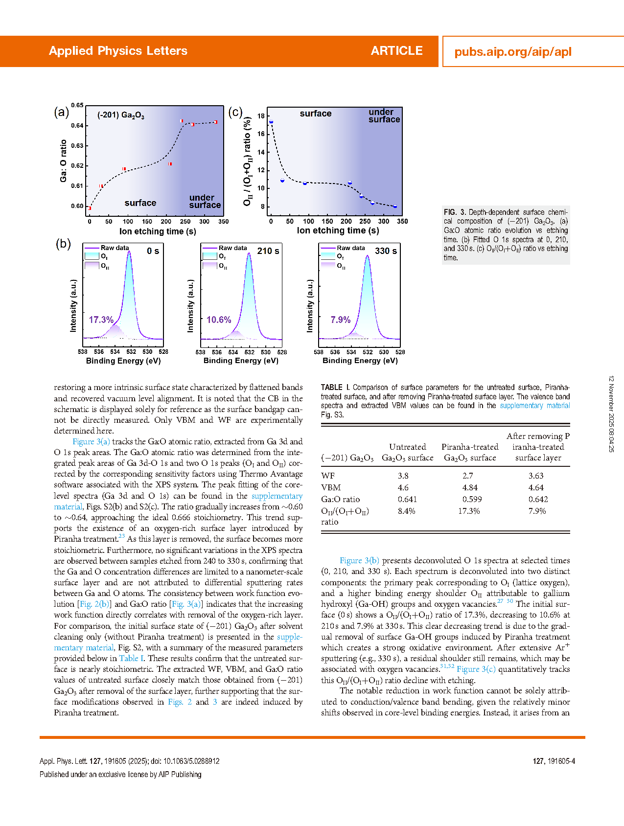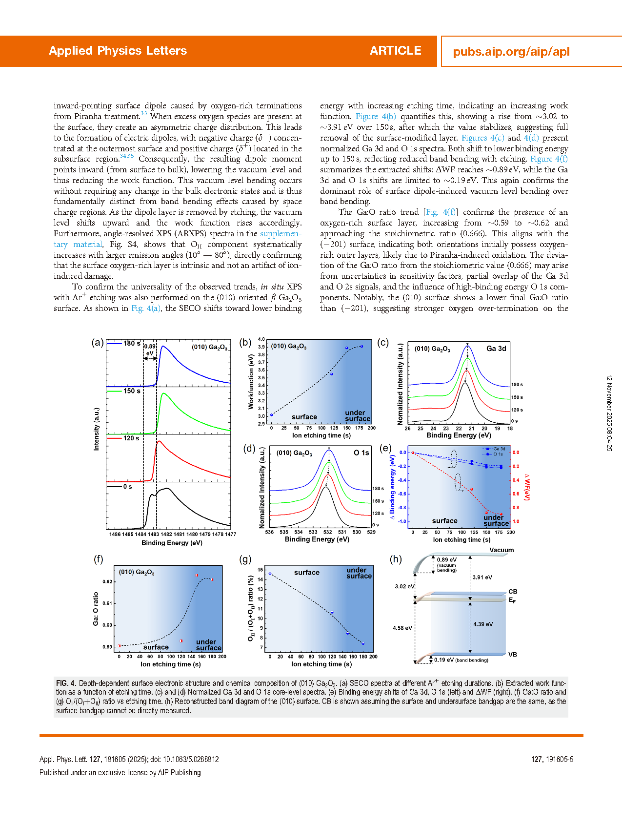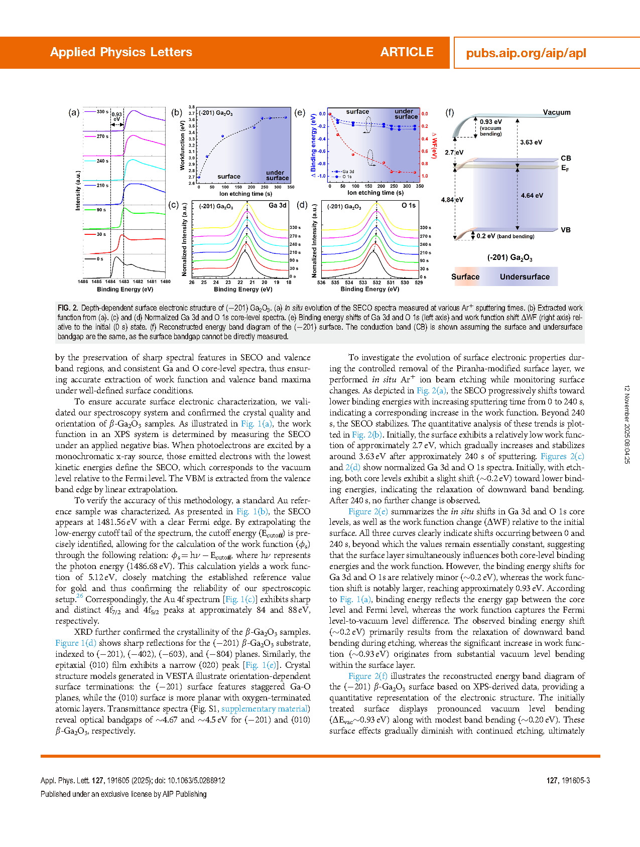 Ga2O3 的表面电子结构对其金属/Ga2O3 接触、半导体/Ga2O3 界面性质以及器件整体性能具有关键影响。然而,基本的表面特性,例如能带弯曲和真空能级弯曲,尤其在表面处理过程中,尚未被充分理解。本研究系统地利用 X 射线光电子能谱(XPS)结合原位 Ar⁺ 离子溅射,考察了 (−201) 和 (010) 晶向 β-Ga2O3 表面的演变过程。两种表面在广泛使用的 Piranha 处理后,功函数显著降低,这主要归因于富氧终端形成的指向内部的表面偶极子。随着离子刻蚀的进行,功函数逐渐升高,并在偶极子层完全去除后最终饱和。Ga:O 比值及 O 1s 峰分解表明 Ga–OH 羟基逐渐减少,使表面回归化学计量组成。定量分析显示,真空能级弯曲 (~0.9 eV) 远大于能带弯曲 (~0.2 eV),凸显了偶极子主导机制。这些结果为表面化学与电子结构之间的复杂相互作用提供了重要见解,并为通过表面偶极子调控进行合理能带对齐和优化 Ga2O3 基器件界面提供了策略。