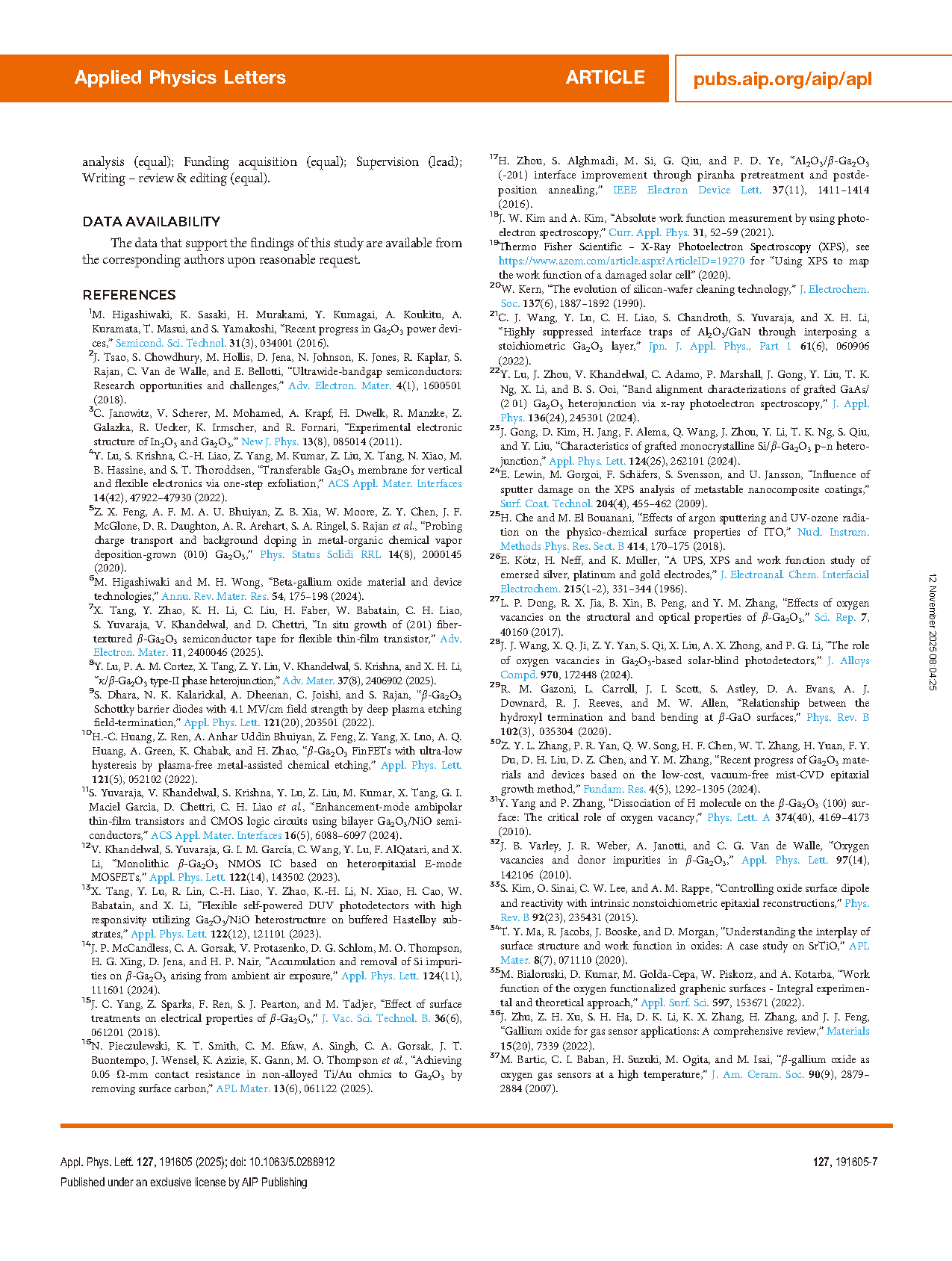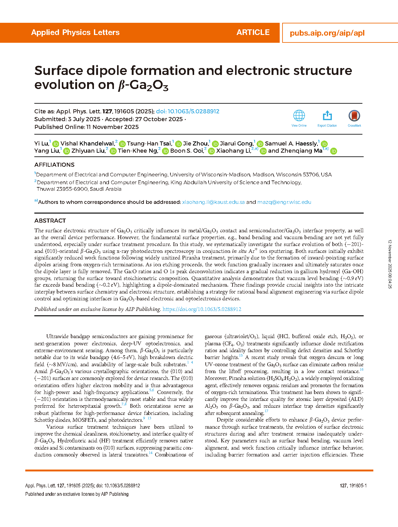 【国际论文】美国威斯康星大学麦迪逊分校陆义博士联合阿卜杜拉国王科技大学李晓航副教授团队:β-Ga₂O₃表面偶极形成及电子结构演化
