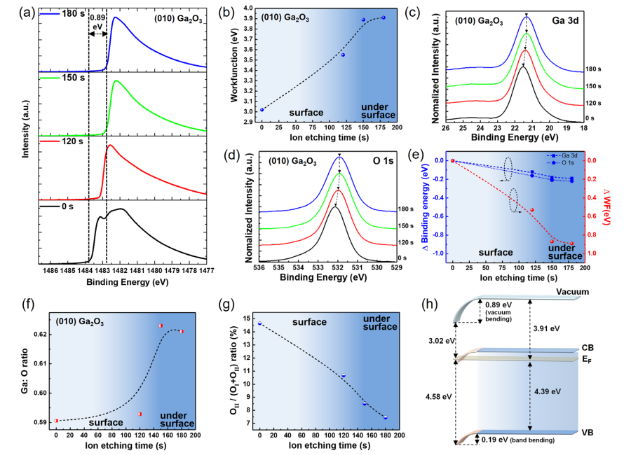 图 4. (010) β-Ga₂O₃ 表面电子结构和化学组成随深度的演变。(a) 不同 Ar⁺ 刻蚀时间下测量的 SECO 光谱。(b) 随刻蚀时间变化提取的功函数。(c) 和 (d) 归一化的 Ga 3d 和 O 1s 核能级光谱。(e) Ga 3d 和 O 1s 结合能偏移(左轴)及功函数偏移 ΔΦₛ(右轴)。(f) Ga:O 原子比随刻蚀时间变化。(g) OII / (OI + OII) 比值随刻蚀时间变化。(h) (010) 表面重构的能带示意图。导带(CB)假设表面和亚表面禁带相同,因为表面禁带无法直接测量。