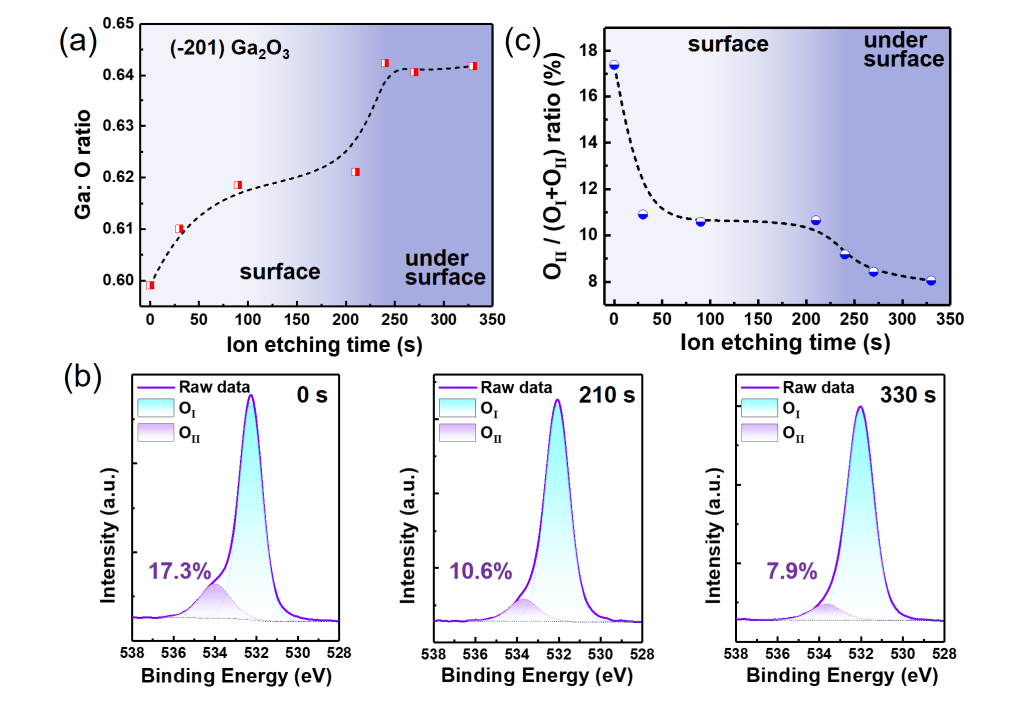 图 3. (−201) β-Ga₂O₃ 表面化学组成随深度的演变。(a) Ga:O 原子比随 Ar⁺ 刻蚀时间的变化。(b) 在 0、210 和 330 s 的 O 1s 拟合光谱。(c) OII / (OI + OII)比值随刻蚀时间的变化。