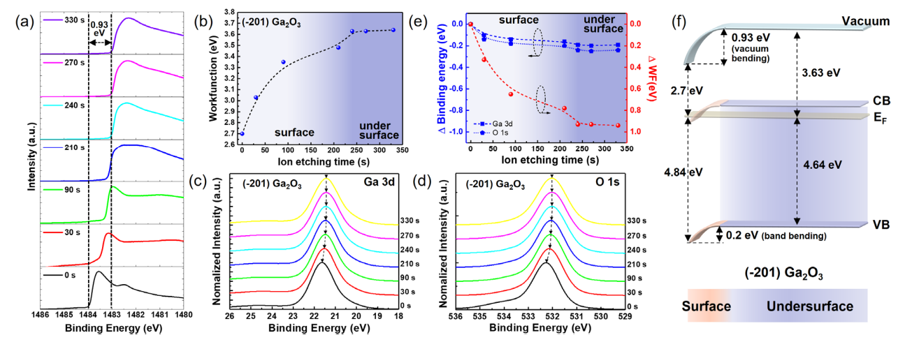 图 2. (−201) β-Ga₂O₃ 表面电子结构随深度的演变。(a) 不同 Ar⁺ 溅射时间下原位测量的 SECO 光谱演变。(b) 从 (a) 提取的功函数。(c) 和 (d) 归一化的 Ga 3d 和 O 1s 核能级光谱。(e) 相对于初始状态 (0 s) 的 Ga 3d 和 O 1s 结合能偏移(左轴)以及功函数偏移 ΔΦₛ(右轴)。(f) (−201) 表面重构的能带示意图。导带(CB)假设表面和亚表面禁带相同,因为表面禁带无法直接测量。