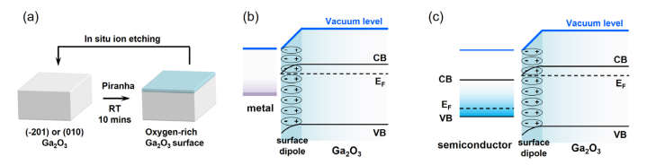 图 5.(a) Piranha 处理与 Ar⁺ 离子刻蚀序列的表面修饰示意图。(b) 金属/β-Ga₂O₃接触示意图。(c) 引入富氧终端的半导体/β-Ga₂O₃ 异质结示意图。