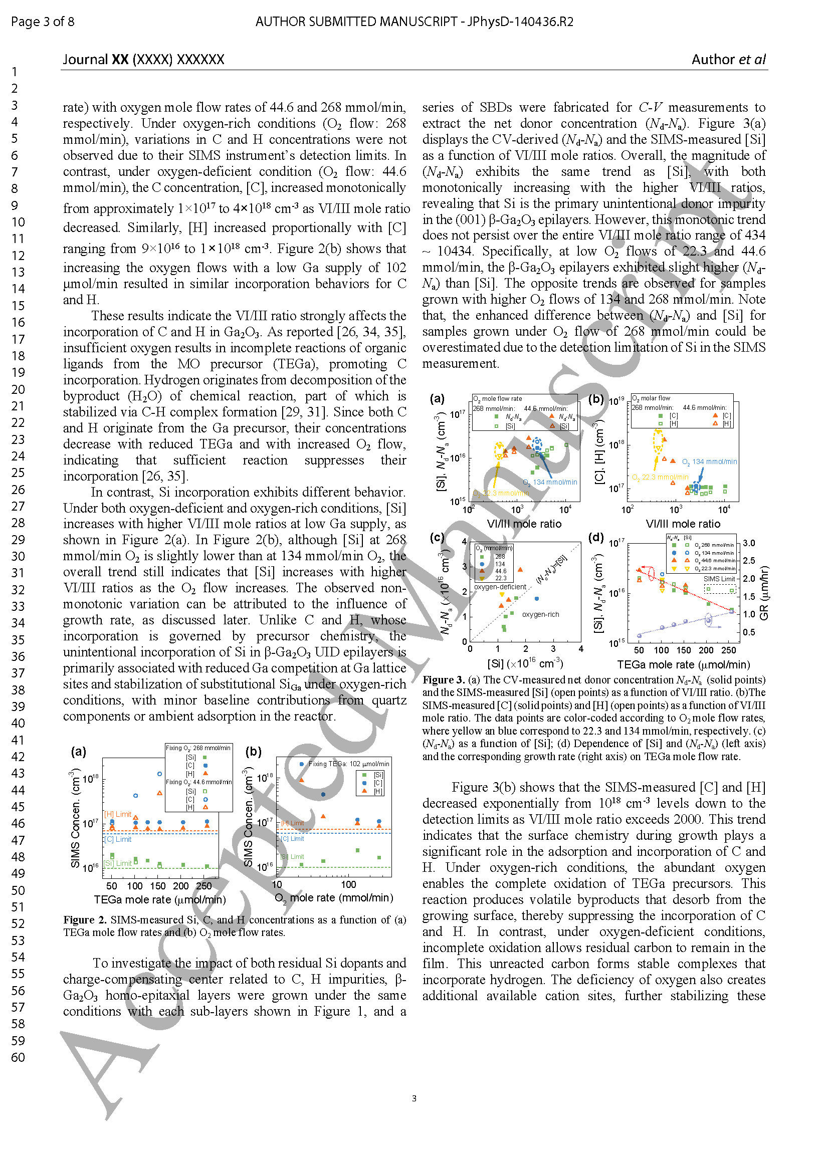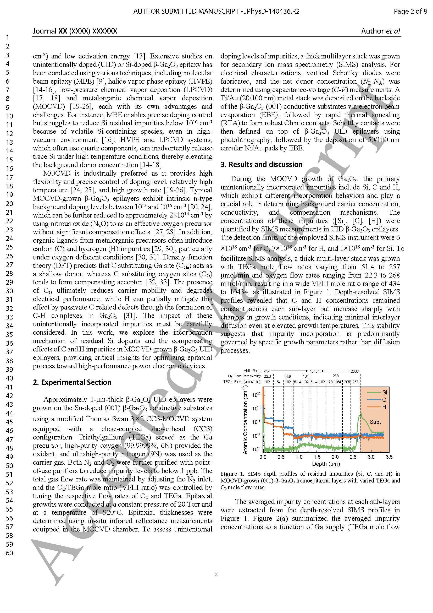 本研究表明,在 MOCVD 生长的 UID (001) β-Ga2O3 外延层中,残余 Si 掺杂主要由生长表面 Ga 和 Si 物种的竞争吸附过程控制。基于 Langmuir 吸附模型建立了 Si 掺杂与生长速率之间的普适定量关系,该关系适用于各种 MOCVD 生长的 β-Ga2O3 UID 外延层,无论衬底晶向或反应器系统如何。尽管碳(C)和氢(H)杂质水平受 VI/III 摩尔比显著影响,但它们对 Si 掺杂的作用仍可忽略不计。通过提高生长速率,残余 Si 掺杂得以抑制,实现净施主浓度降低至 4.73×1015 cm-3。这些结果为理解 Si 掺杂机制提供了基础框架,并为制备高纯度 β-Ga2O3 以应用于高性能功率电子器件奠定了基础。