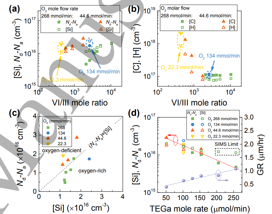 图 3. (a) CV 测得的净施主浓度 Nd−Na(实心点)和 SIMS 测得的 [Si](空心点)随 VI/III 比的变化关系。(b) SIMS 测得的 [C](实心点)和 [H](空心点)随 VI/III 摩尔比的变化关系。数据点按 O₂ 摩尔流量颜色编码,其中黄色和蓝色分别对应 22.3 和 134 mmol/min。(c) Nd−Na 与 [Si] 的关系。(d) [Si] 和 Nd−Na(左轴)及对应生长速率(右轴)随 TEGa 摩尔流量的变化关系。