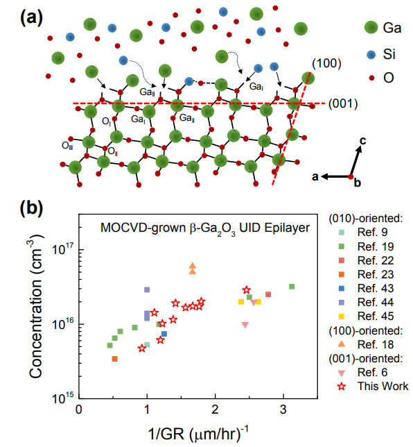 图 4. (a) (001)-β-Ga₂O₃ 生长表面 Si 与 Ga 物种竞争吸附示意图。(b) 不同 MOCVD 系统生长的 (001)、(100) 和 (010) 取向先进 UID β-Ga₂O₃ 外延层中残余 [Si] 与背景载流子浓度随 1/生长速率 (1/GR) 的变化关系。