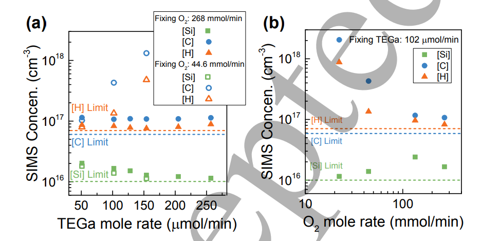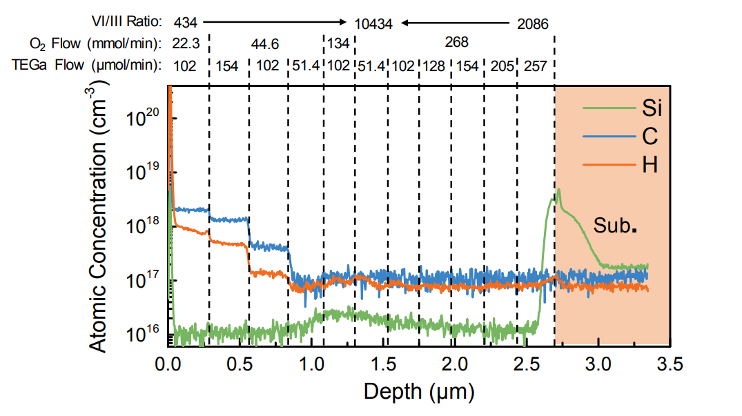 图 1. 在不同 TEGa 和 O₂ 摩尔流量下,MOCVD 生长的 (001) β-Ga₂O₃ 同质外延层中残余杂质(Si、C 和 H)的 SIMS 深度分布曲线。