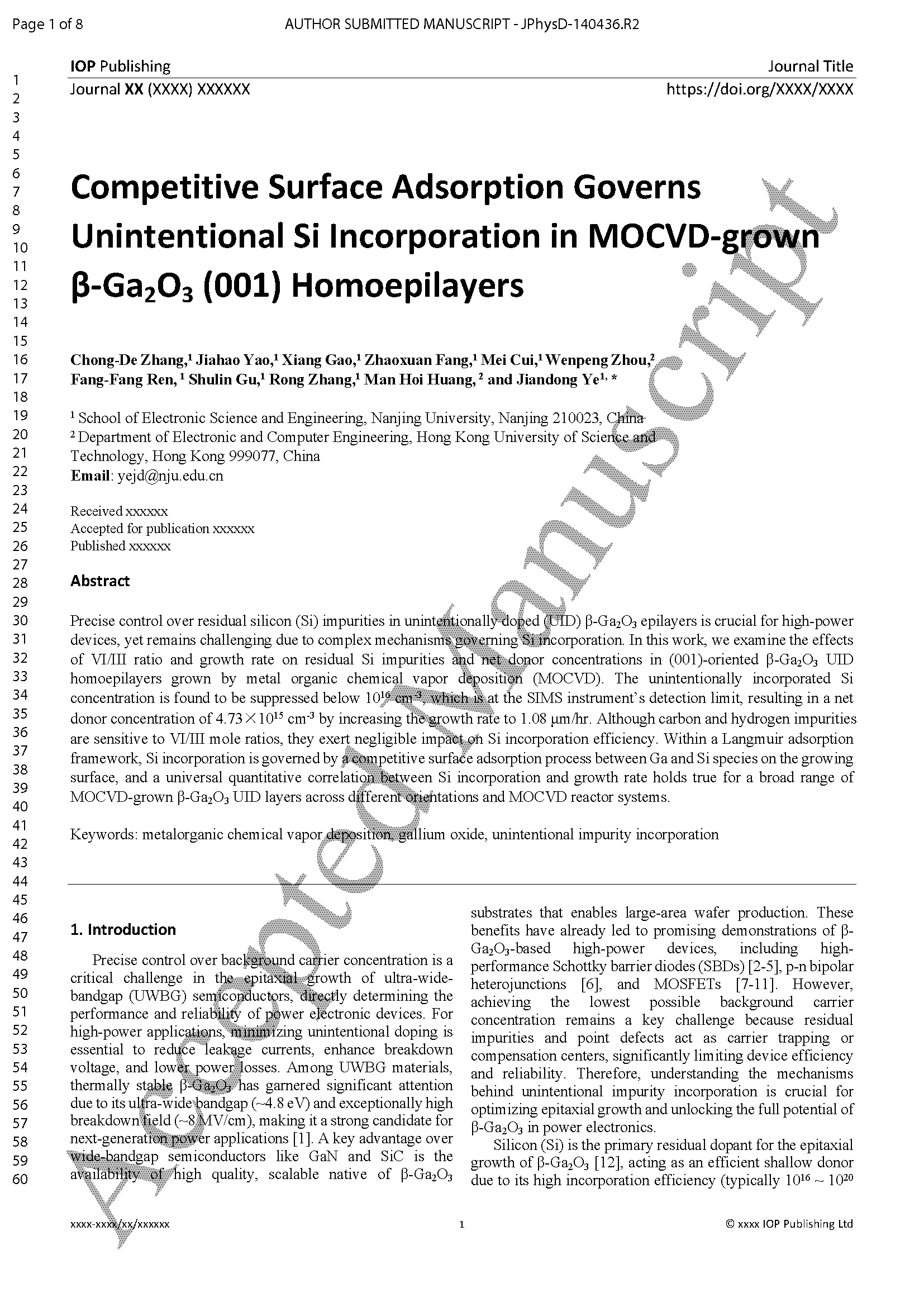 由南京大学叶建东教授领导的研究团队在学术期刊 Journal of Physics D: Applied Physics 发布了一篇名为 Competitive surface adsorption governs unintentional Si incorporation in MOCVD-grown β-Ga2O3 (001) homoepilayers(MOCVD 生长 β-Ga2O3 (001) 同质外延层中非故意 Si 掺杂的主导机制:竞争性表面吸附)的文章。