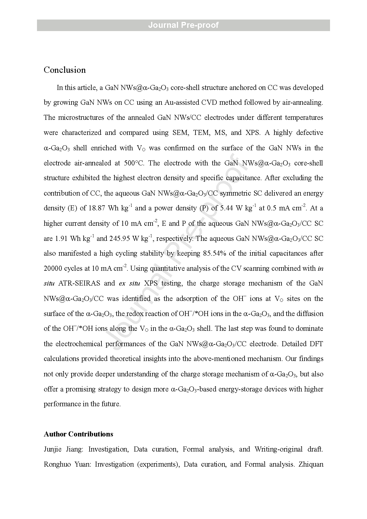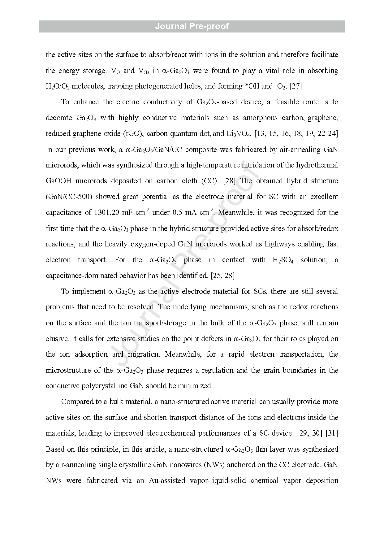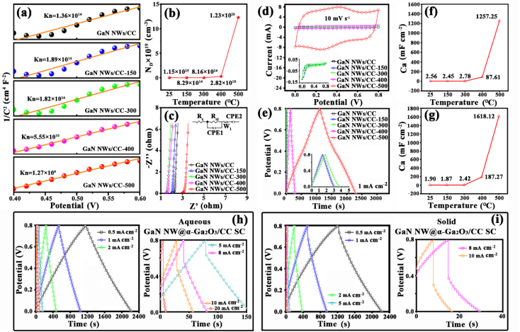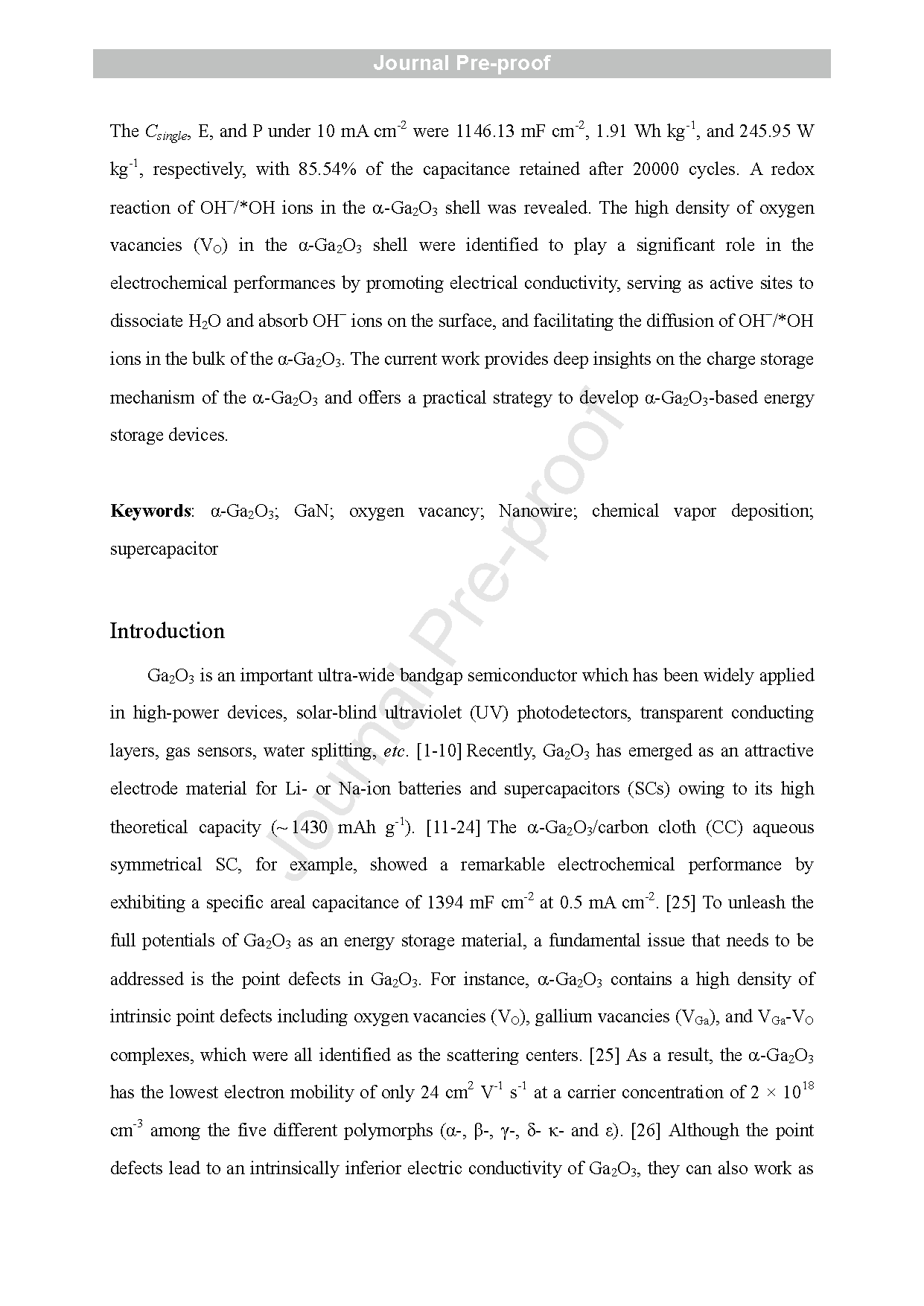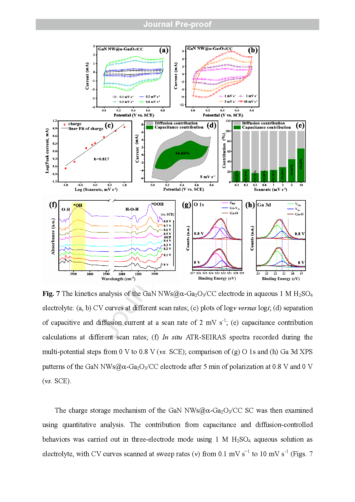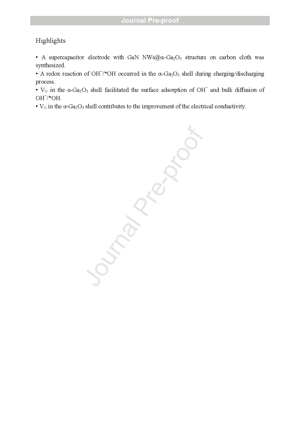 • 在碳布基底上成功制备了具有 GaN NWs@α-Ga2O3 结构的超级电容器电极。