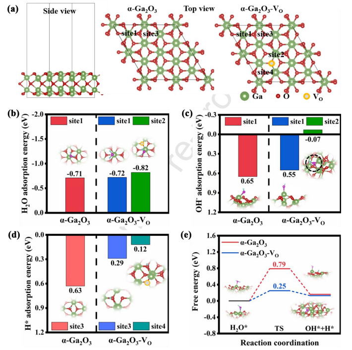 图 9 (a) α-Ga2O3 与 α-Ga2O3–VO 薄层模型的优化结构及吸附位点示意;(b) H2O、(c) OH⁻、(d) H* 在不同吸附位点的吸附能;(e) 水分子解离的能垒示意图。