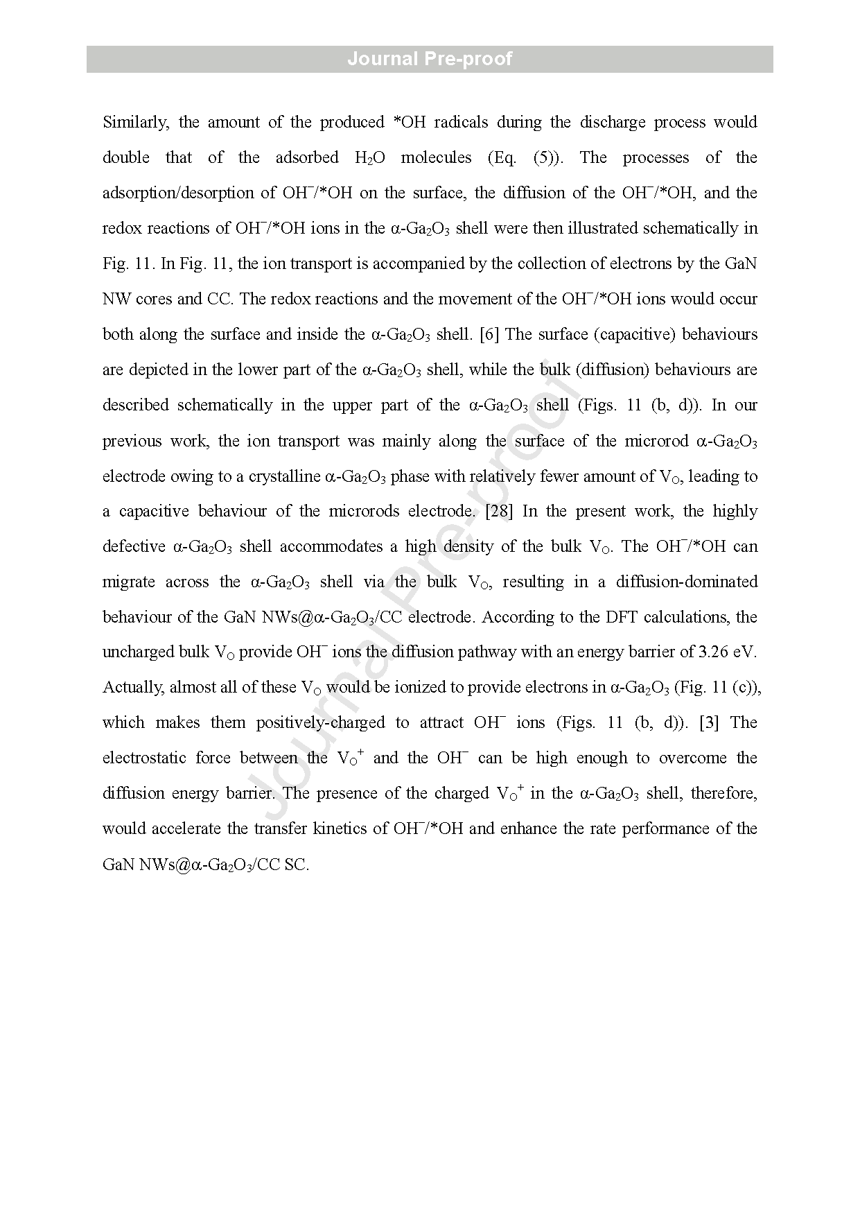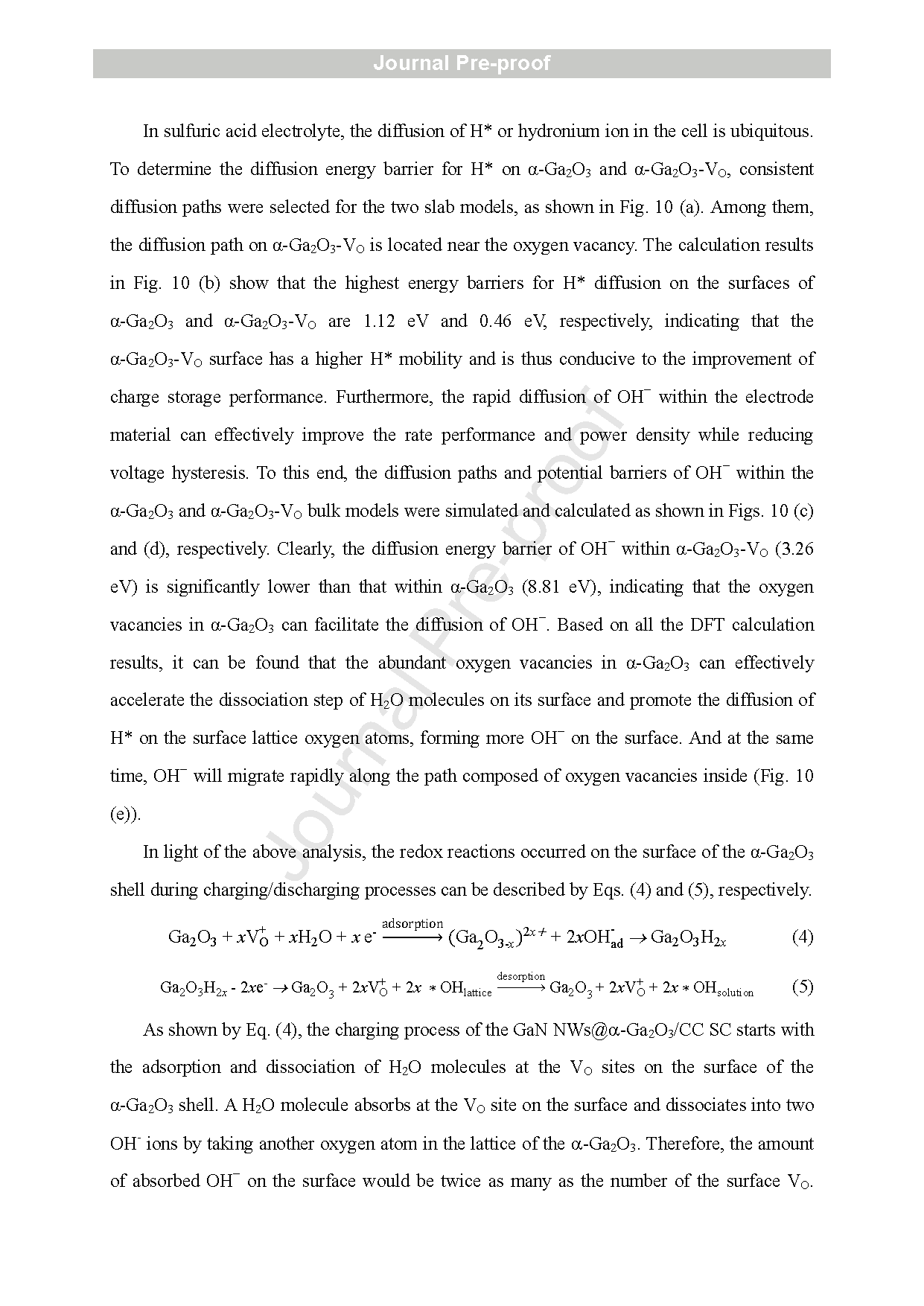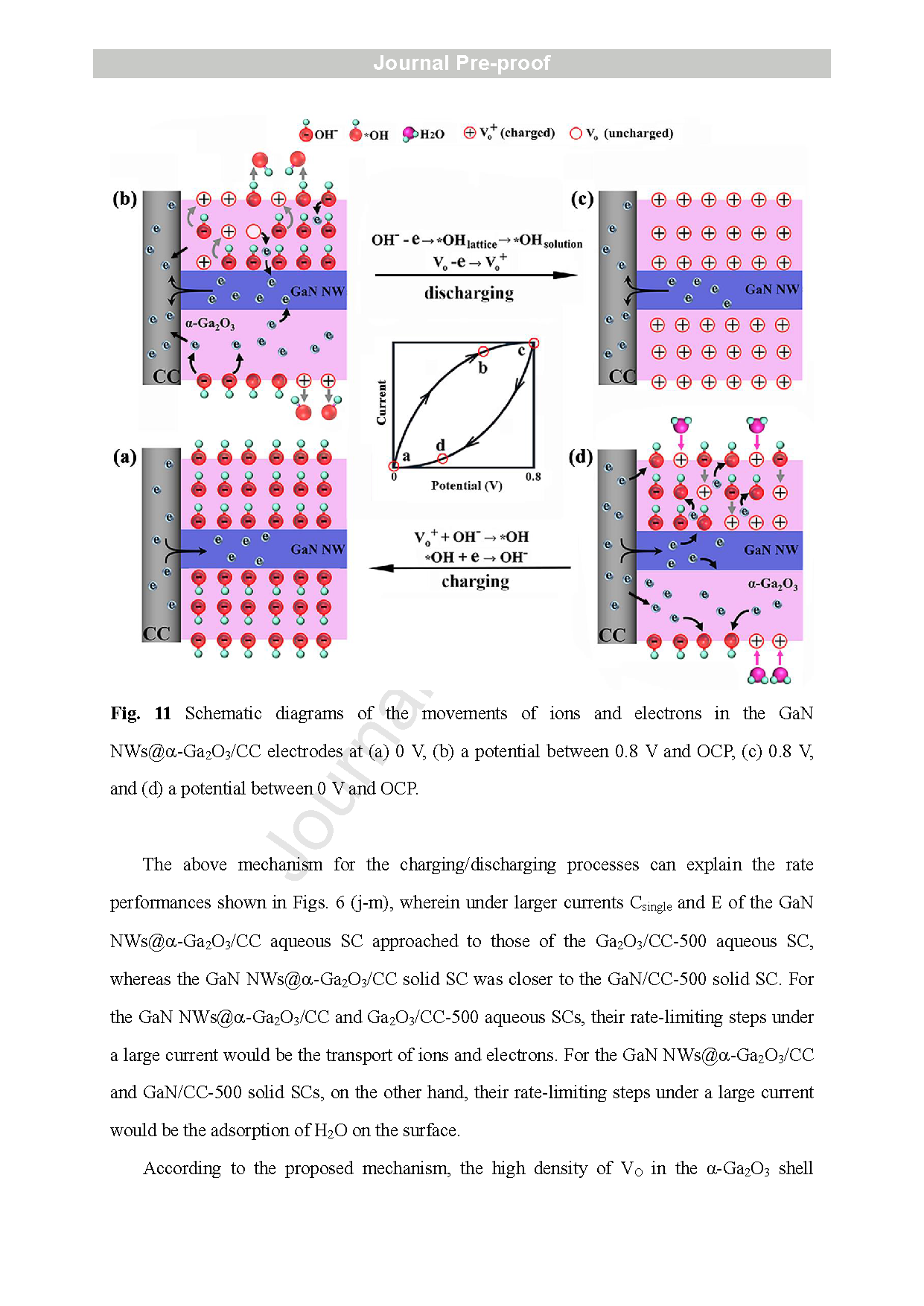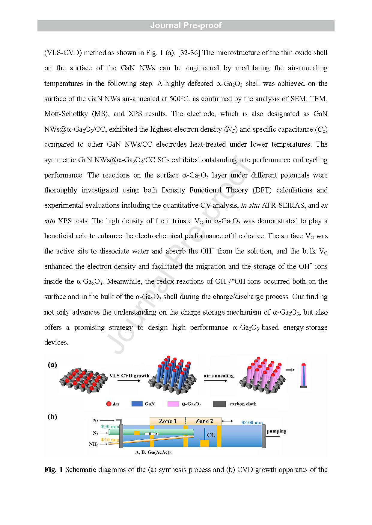 本文采用金辅助 CVD 方法在碳布(CC)上生长 GaN 纳米线(GaN NWs),并经空气退火处理,构建了一种锚定在 CC 上的 GaN NWs@α-Ga2O3 核–壳结构。通过 SEM、TEM、MS 和 XPS 等手段,对不同退火温度下的 GaN NWs/CC 电极的微观结构进行了系统表征与对比。结果表明,在 500 ℃ 空气退火条件下,GaN 纳米线表面形成了一层富含氧空位(VO)的高缺陷 α-Ga2O3 壳层。具有 GaN NWs@α-Ga2O3 核–壳结构的电极表现出最高的电子浓度和比电容。在扣除碳布贡献后,GaN NWs@α-Ga2O3/CC 水系对称超级电容器在 0.5 mA cm-2 下实现了 18.87 Wh kg-1 的能量密度(E)和 5.44 W kg⁻¹ 的功率密度(P)。当电流密度提高至 10 mA cm-2 时,其能量密度和功率密度分别为 1.91 Wh kg⁻¹ 和 245.95 W kg⁻¹。此外,该水系 GaN NWs@α-Ga2O3/CC 对称超级电容器在 10 mA cm-2 下循环 20000 次后仍能保持 85.54% 的初始电容,表现出优异的循环稳定性。通过对 CV 扫描的定量分析,并结合原位 ATR-SEIRAS 与非原位 XPS 表征,明确了 GaN NWs@α-Ga2O3/CC 的储能机理:包括 OH⁻ 离子在 α-Ga2O3 表面氧空位处的吸附、α-Ga2O3 中 OH⁻/*OH 离子的氧化还原反应,以及 OH⁻/*OH 离子沿 α-Ga2O3 壳层中氧空位的扩散。其中,最后一步被证实是主导 GaN NWs@α-Ga2O3/CC 电极电化学性能的关键因素。进一步的 DFT 计算为上述机理提供了理论支撑。本研究不仅加深了对 α-Ga2O3 储能机理的理解,也为未来设计和开发性能更优异的 α-Ga2O3 基储能器件提供了一种具有前景的策略。