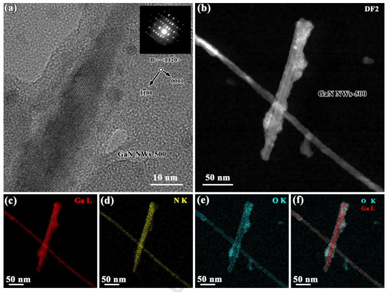 图 4 (a) GaN NWs/CC-500 中单根纳米线的 HRTEM 图像及其对应的 CBED 图样(插图);(b) GaN NWs/CC-500 的 DF-STEM 图像;(c–f) 对应的 EDS/STEM 元素分布(净强度)图,分别为 Ga、N、O 及 O/Ga。