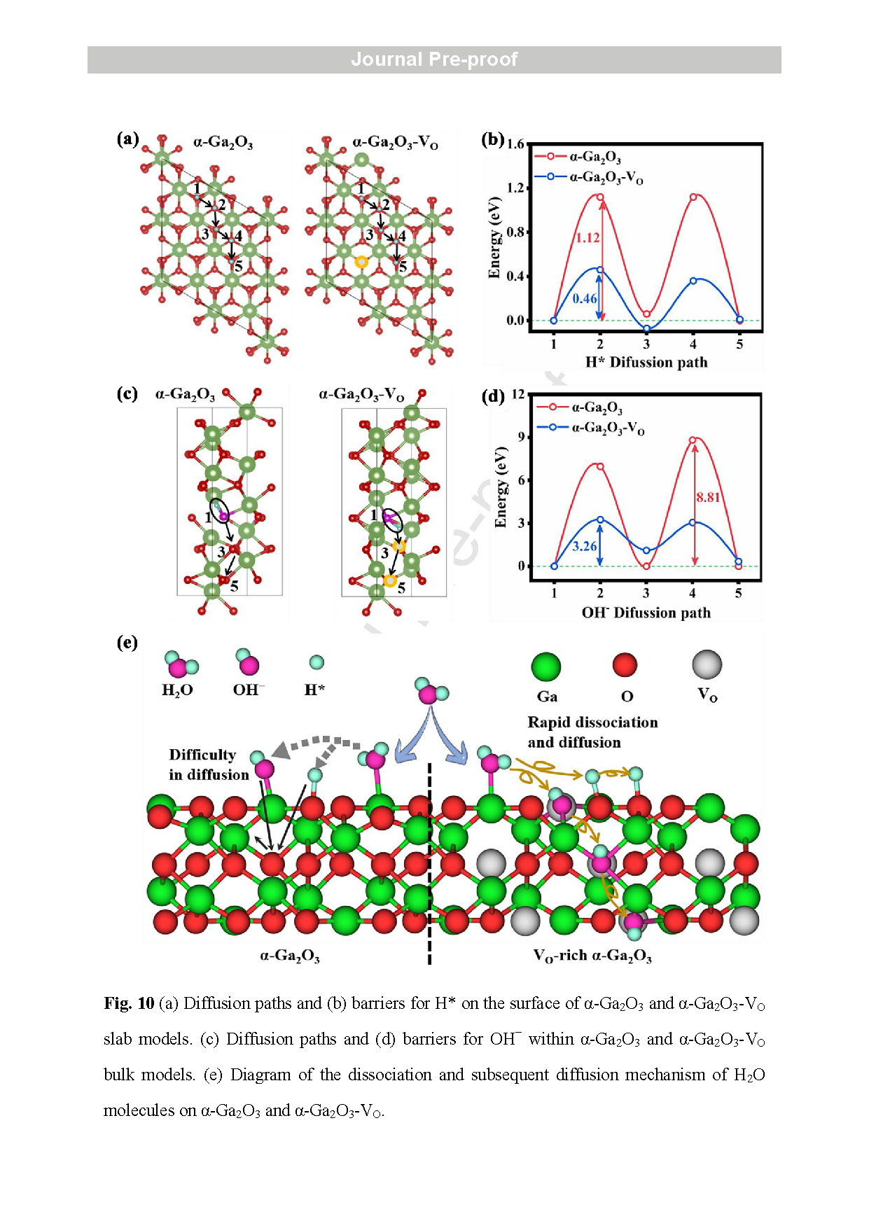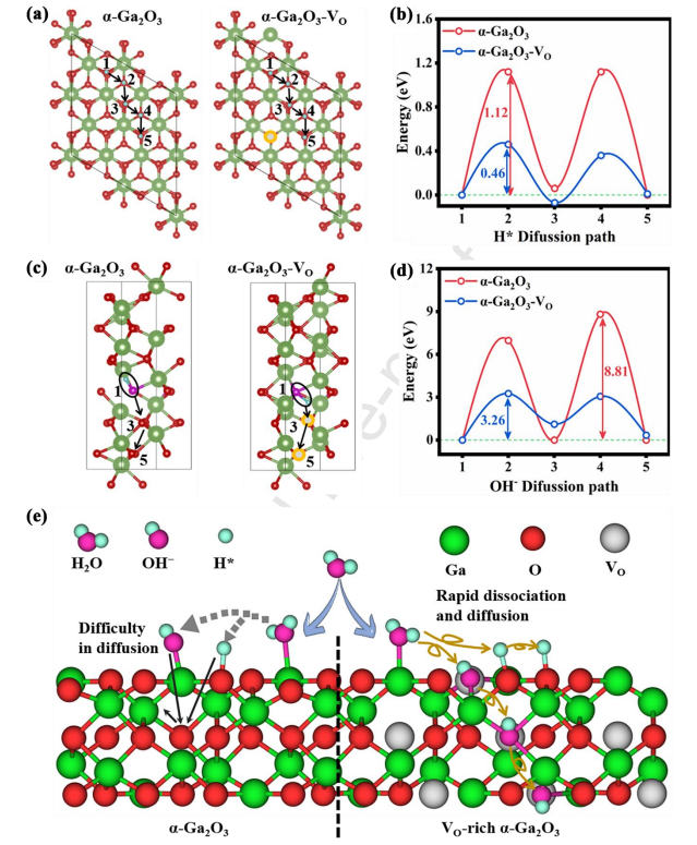 图 10 (a) H* 在 α-Ga2O3 与 α-Ga2O3–VO 表面上的扩散路径;(b) 对应的扩散能垒;(c) OH⁻ 在 α-Ga2O3 与 α-Ga2O3–VO 体相中的扩散路径;(d) 对应的扩散能垒;(e) H2O 分子在 α-Ga2O3 与 α-Ga2O3–VO 上的解离及后续扩散机制示意图。
