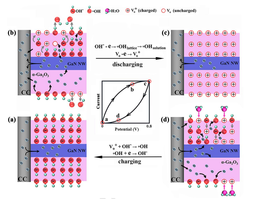 图 11 GaN NWs@α-Ga2O3/CC 电极中离子与电子迁移示意图:(a) 0 V;(b) 0.8 V 与开路电位(OCP)之间;(c) 0.8 V;(d) 0 V 与开路电位(OCP)之间。