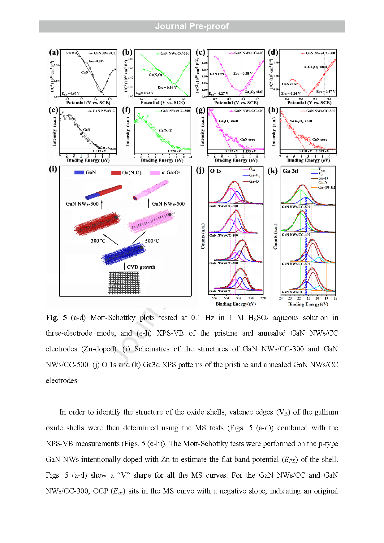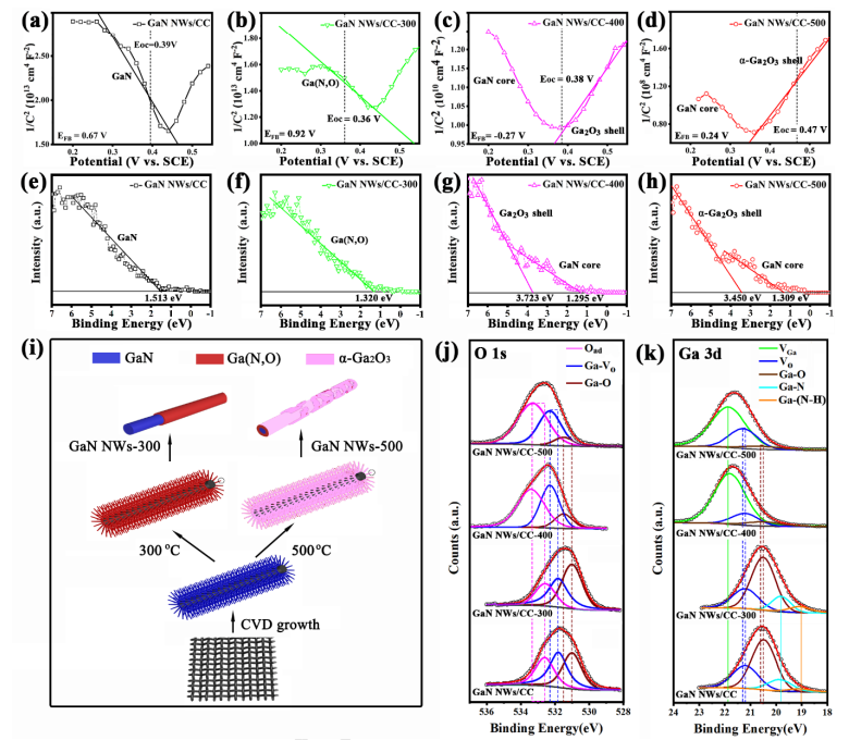 图 5 (a–d) 在三电极体系、1 M H2SO4 水溶液中、0.1 Hz 条件下测试的 Mott–Schottky 曲线;(e–h) 原始及退火后 GaN NWs/CC 电极(Zn 掺杂)的 XPS 价带谱(VB);(i) GaN NWs/CC-300 与 GaN NWs/CC-500 的结构示意图;(j) O 1s 与 (k) Ga 3d 的 XPS 谱图(原始及退火后 GaN NWs/CC 电极)。